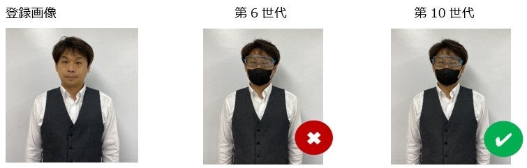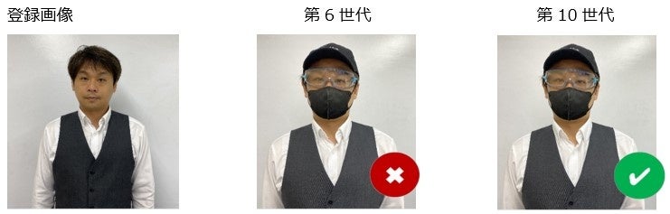 例1: マスクとゴーグルを着用した状態での積極認証の結果において、従来の第6世代顔認証モデル (VH) の場合、一般的な生体認証において最も厳しい他人受入率では同一人物と判定することが難しかったケースが第10世代顔認証モデルでは本人と判定可能となりました。