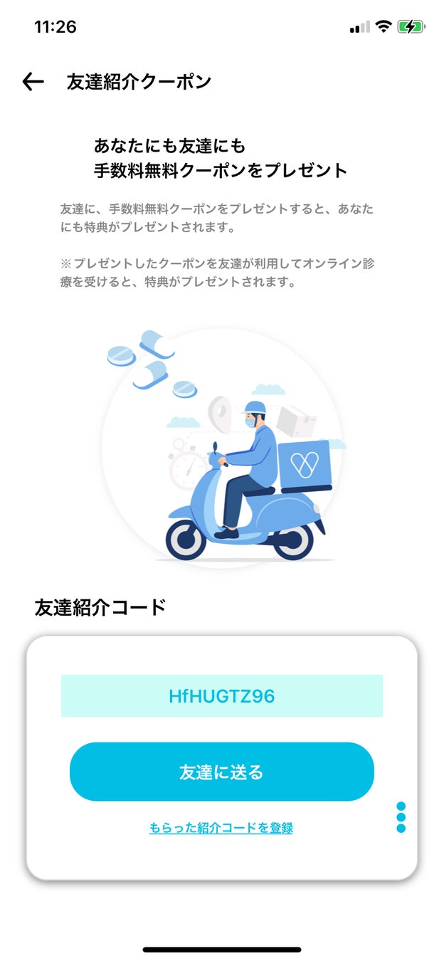 ②ご紹介先の方は、「友達紹介コード」を入力後に初めて「SOKUYAKU」を利用すると、オンライン診療・オンライン服薬指導時にかかるシステム利用料初回利用分550円(税込)が無料※1になります。