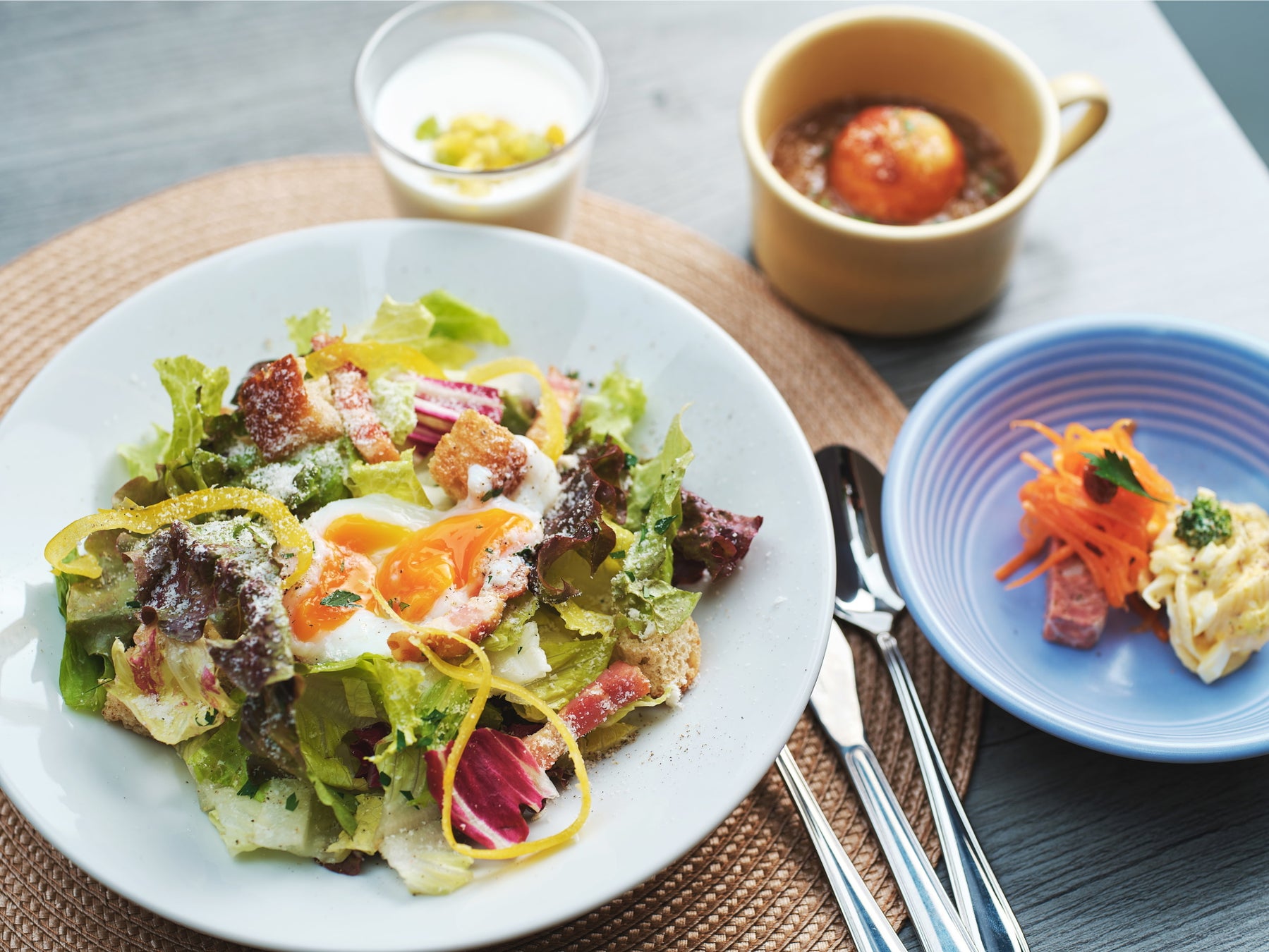 新鮮な葉野菜、ベーコン、ハーブを練り込んだ香りの良いクルトンに温度卵をトッピング。チーズとアンチョビの濃厚なドレッシングが歯切れの良い野菜に絡まり絶妙な美味しさを演出します。