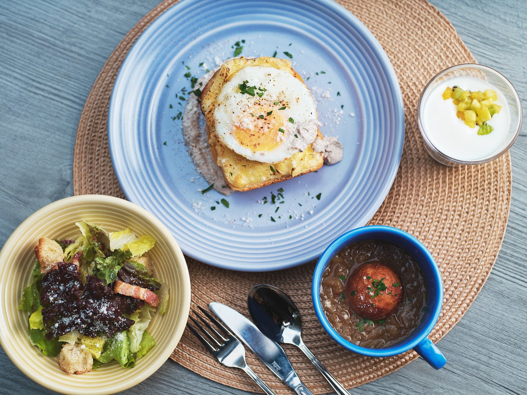 ブーランジェリーグーの国産小麦を使用した食パンに自家製ベシャメルソース、ロースハムを挟み込み目玉焼きをトッピングし、フランスの定番食クロックマダムを上質に。