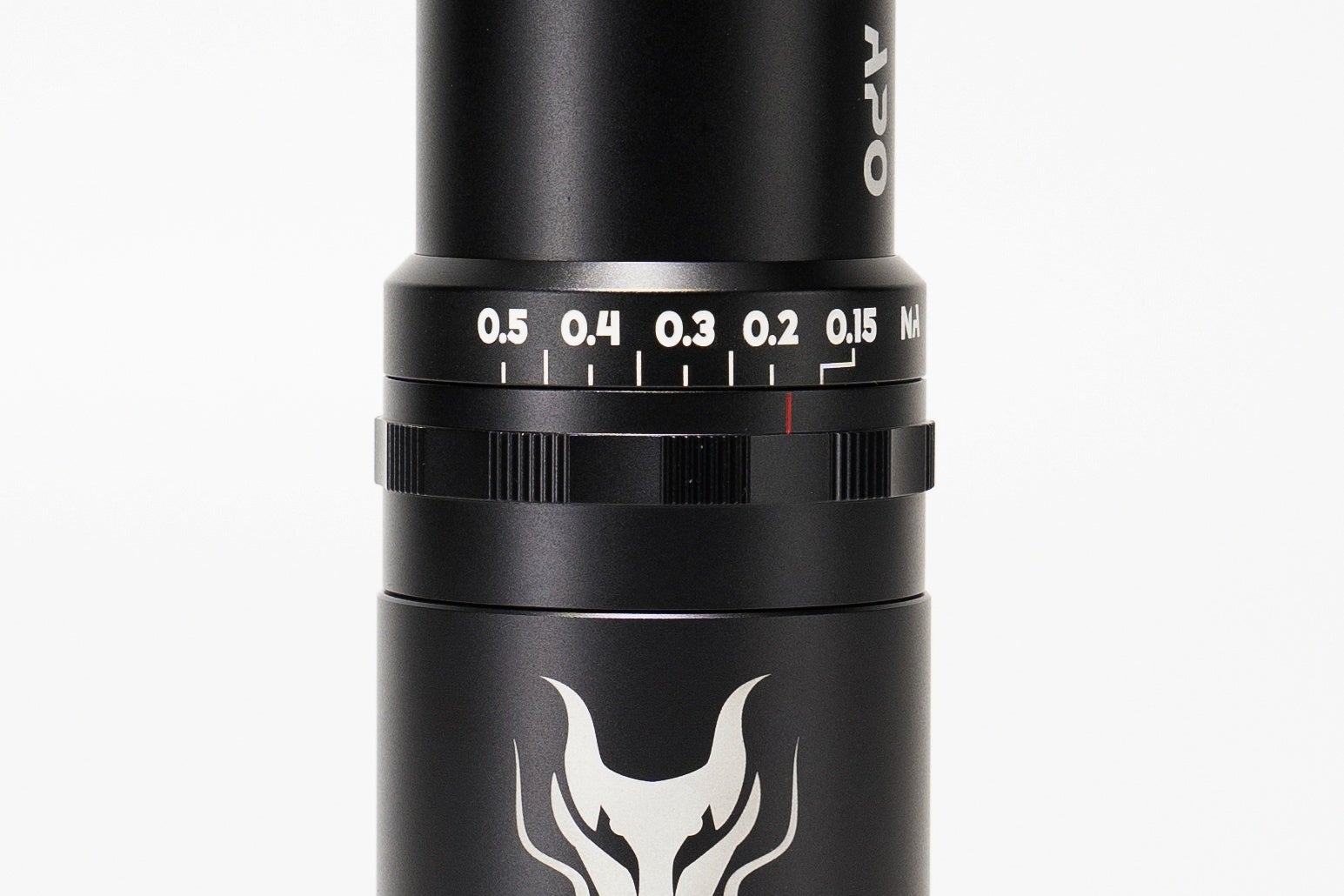 対物レンズ側に刻まれている0.5~0.15まで8段階のNA値は、顕微鏡撮影の被写界深度に対応しています。大きなNA値により低いISO感度で撮影できるため、より鮮明な画像が得られます。