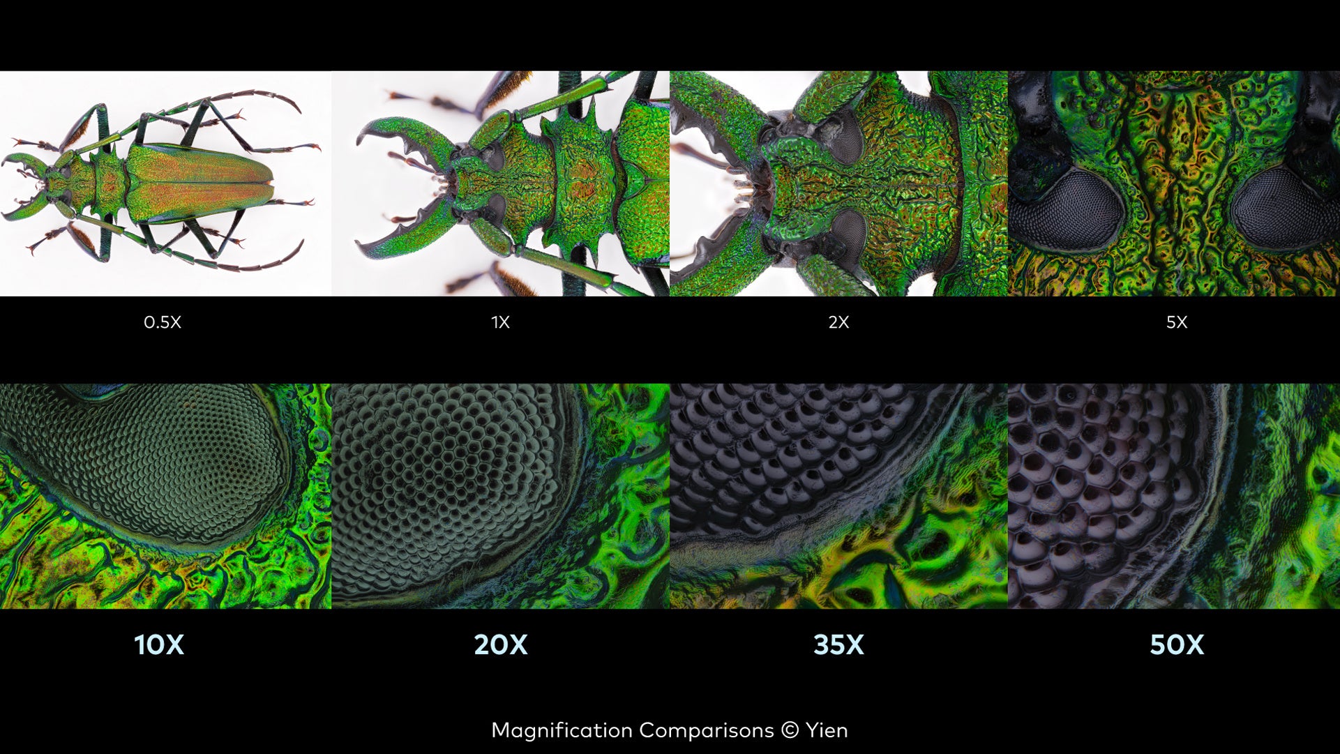 目に見えない美しさを捉えるために10倍、20倍、35倍、50倍と倍率を切り替えることができます。レンズ本体は、カメラに取り付ける切り替え可能な倍率チューブと前面の対物レンズの2つの部分で構成されます。固定用のセットを前面側レンズに取り付けることで、カメラ側の倍率チューブを簡単に切り替えることができます。
