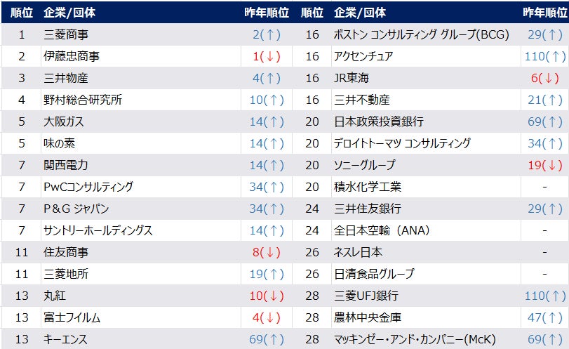 ・関西に本社を置く企業が人気です。大阪ガス5位(昨年14位、最上位校全体ランキング43位)、関西電力7位(昨年14位、最上位校全体ランキング53位)、キーエンス13位(昨年69位、最上位校全体ランキング48位)、積水化学工業20位(昨年データ無し、最上位校全体ランキング39位)。