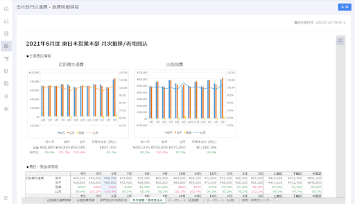 今回のバージョンアップでは、複合グラフの作成ができるようになりました。これにより、複数の情報を一つのグラフで可視化できるようになります。分析の幅が広がり、対前期比分析で金額と比率を重ねた傾向把握等ができるようになります。