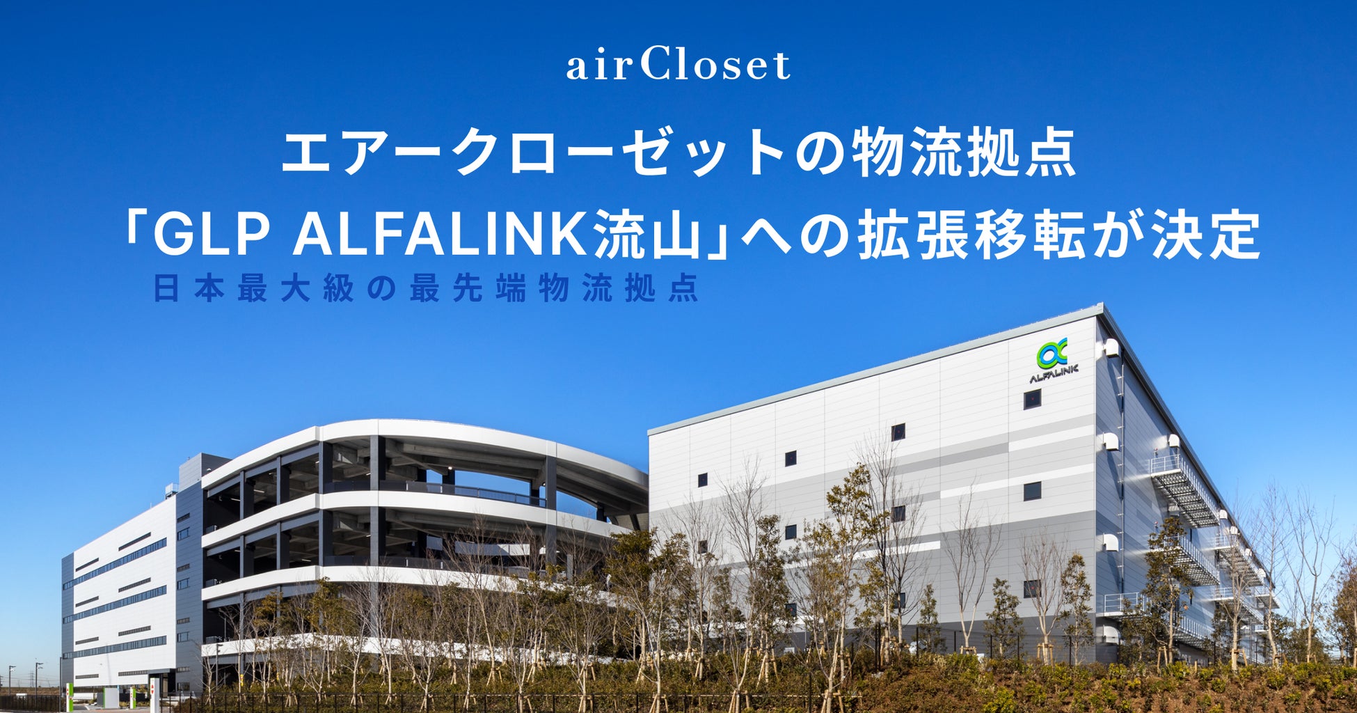 株式会社エアークローゼット(本社:東京都港区、代表取締役社長 兼 CEO:天沼 聰)は、物流拠点を「GLP ALFALINK流山6」に拡張移転することを決定しました。今回の移転は、当社が運営する月額制ファッションレンタルサービス『airCloset(エアークローゼット)』の事業拡大および循環型物流プラットフォーム「AC-PORT」のニーズ拡大に伴う、物流基盤の強化を目的としています。なお、2024年7月より関連する機能の順次移転を予定しています。