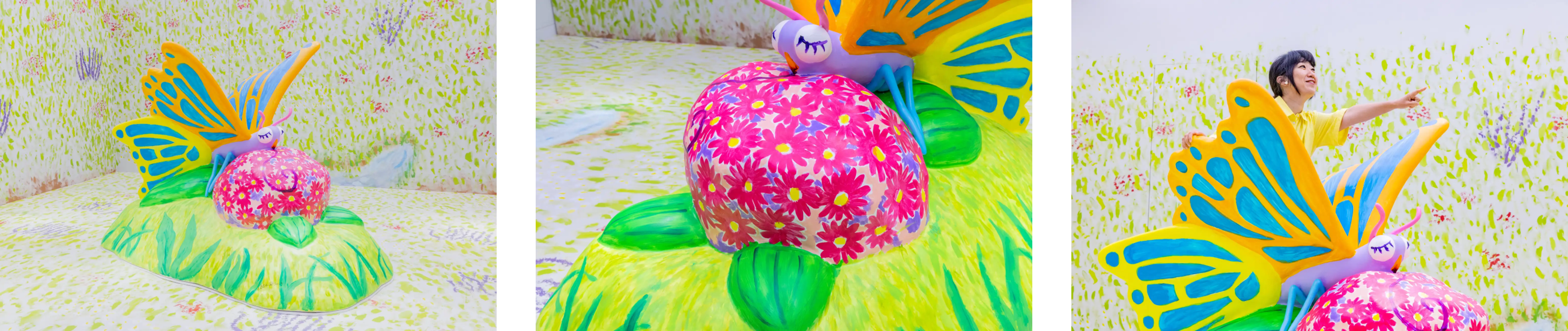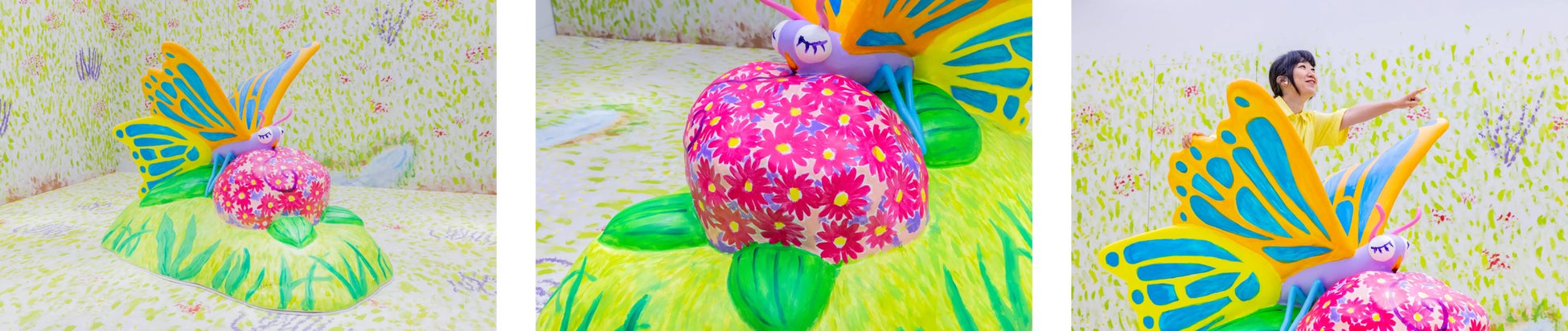 蝶々のオブジェは大宮氏の新作で、さらに「屋内空間×立体物」の演出は同氏にとって初めてのチャレンジとなります。夏の日差しが降り注ぐ島という空間の中で、オブジェに自由に触れて乗ることもでき、五感でアート空間の世界を楽しむことができます。