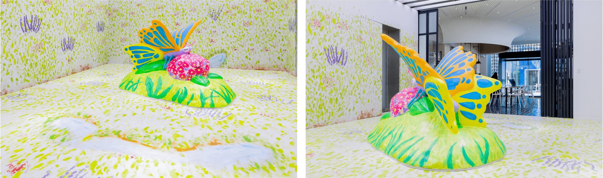 本アート展示のコンセプトは「島」。自然と生き物と人間が共に助け合って生きている島をイメージし、ガレージ中央には大きな立体の蝶々のオブジェを配し、大宮氏による草原の絵で壁面と床を埋め尽くした空間となっております。
