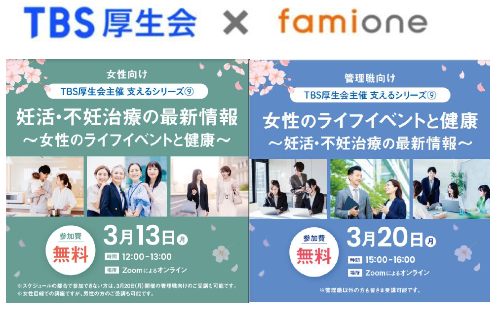 「子どもを願うすべての人によりそい幸せな人生を歩める社会をつくる」をビジョンに掲げ、LINEを活用した妊活コンシェルジュサービス「famione(ファミワン)」 https://lp.famione.com/ を提供する株式会社ファミワン(本社:東京都渋谷区、代表取締役:石川勇介、以下当社)は、TBSグループの従業員で構成されたTBS厚生会(本社:東京都港区、理事長:重宗宏彦、以下「TBS厚生会」)へ提供の一環として、「妊活・不妊治療の最新情報~女性のライフイベントと健康」を開催します。