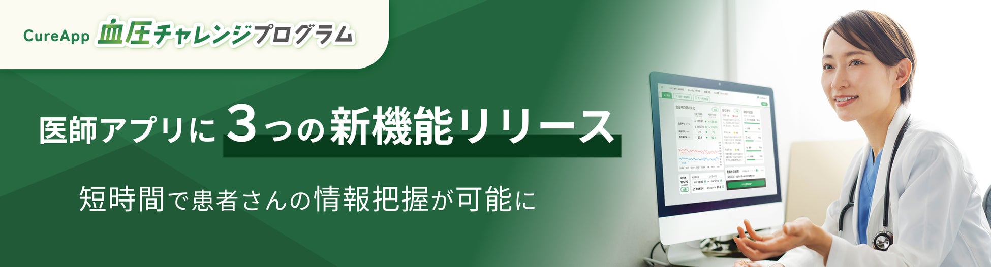 株式会社CureApp(キュア・アップ / 本社:東京都中央区 代表取締役社長:佐竹 晃太)は、当社が高血圧症患者さんのために開発し、医療機関にて医師による処方が開始されている「CureApp HT 高血圧治療補助アプリ」(以下、本アプリ)および付帯サービスを含めて提供する「CureApp 血圧チャレンジプログラム」について、医師側のニーズと患者さん側のニーズをそれぞれ活かし、高血圧治療の基本である生活習慣指導を、忙しく限られた診療時間内でもより効率的に実施できるようにすることを目指し、明日10月23日よりアップデートすることをお知らせいたします。