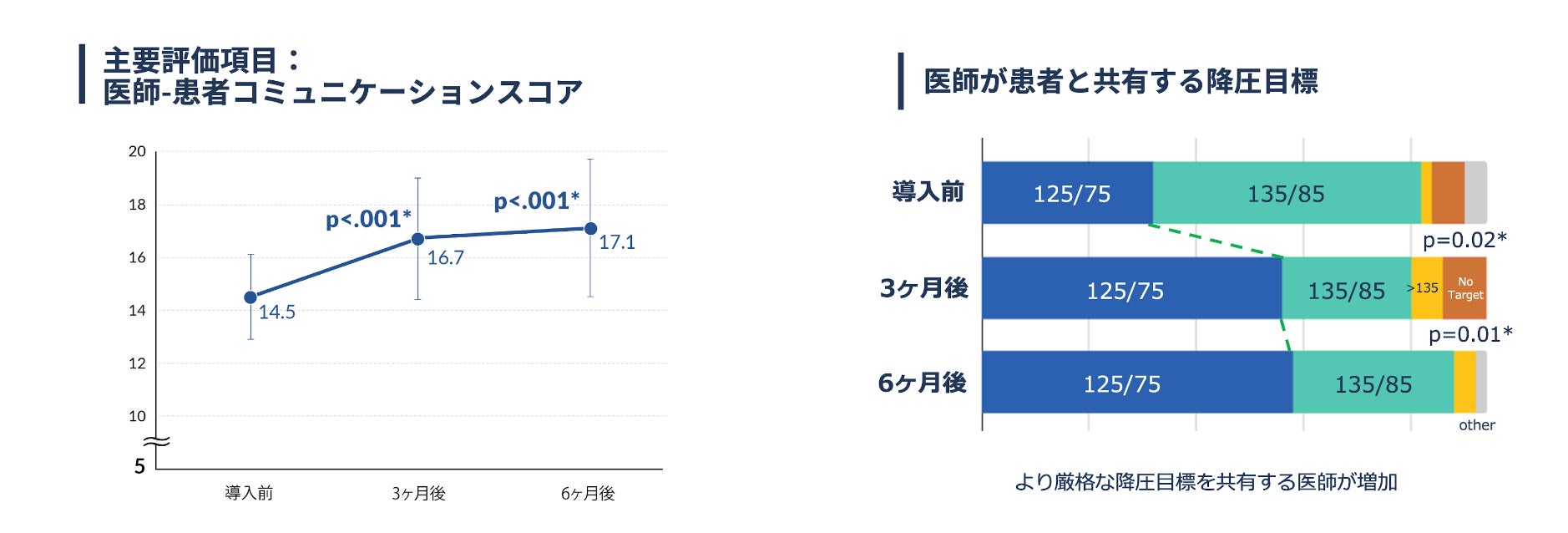 本アプリ導入前後で医師と患者さんとの間のコミュニケーションのスコアが有意に改善しました。 (導入前 14.5→6ヶ月後 17.1、 p<0.001) また、患者さんと共有する降圧目標値を125/75 mmHgと答えた医師が有意に増加しました (34.0%→59.6%、 p=0.01)。