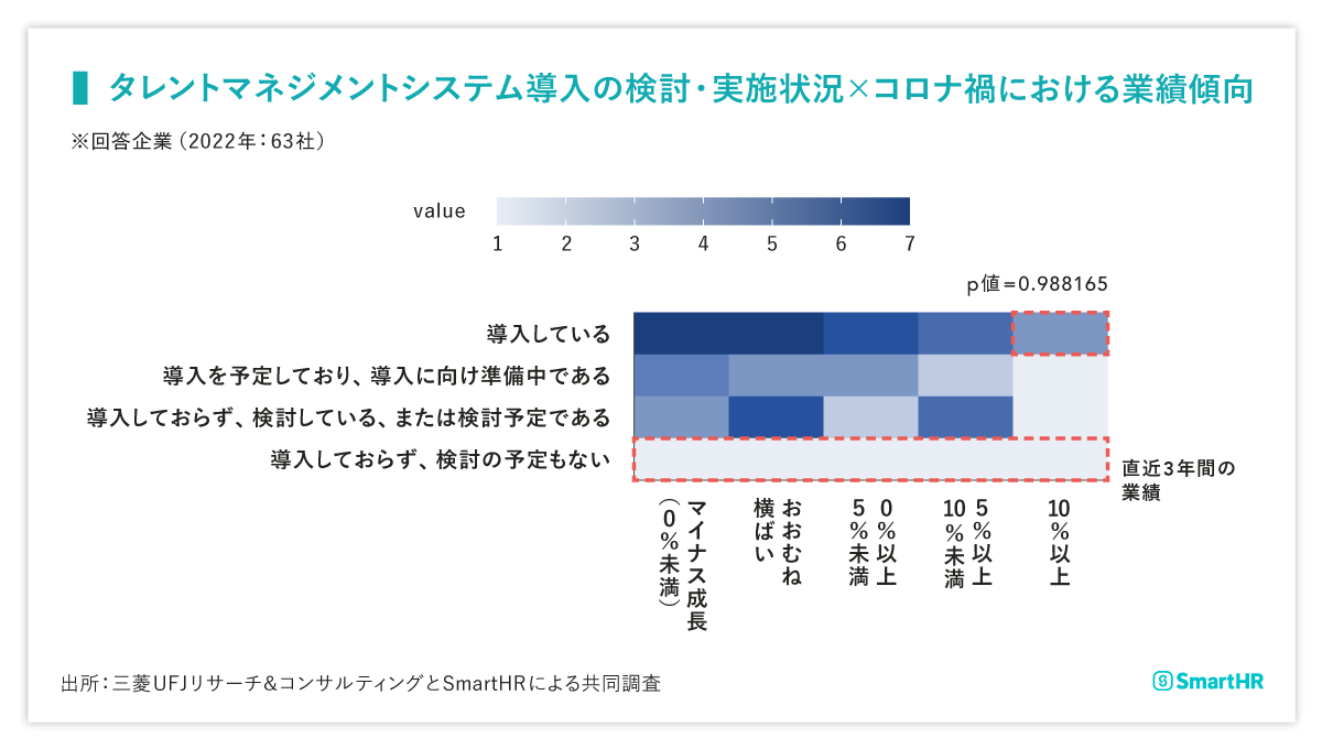 - 業績傾向に関係なく、ほとんどの企業がタレントマネジメントシステムを導入、または導入検討をしている。コロナ禍(直近3年間)の業績が10%以上成長している企業では、ほとんどの企業がタレントマネジメントシステムを導入している
