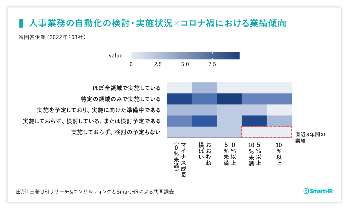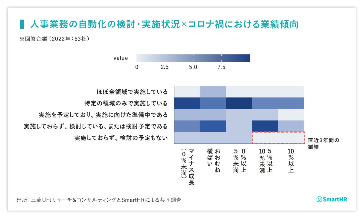- コロナ禍(直近3年間)の業績が5%以上成長している企業では人事業務の自動化を「実施しておらず、検討の予定もない」企業は少ない