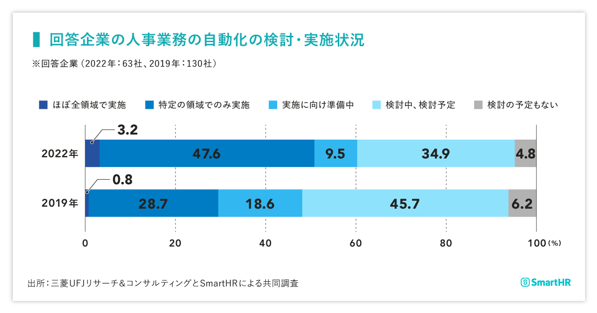 - 人事業務の自動化を「特定の領域」で実施している企業が大幅に増えており、今回の回答企業の半数以上では自動化されている