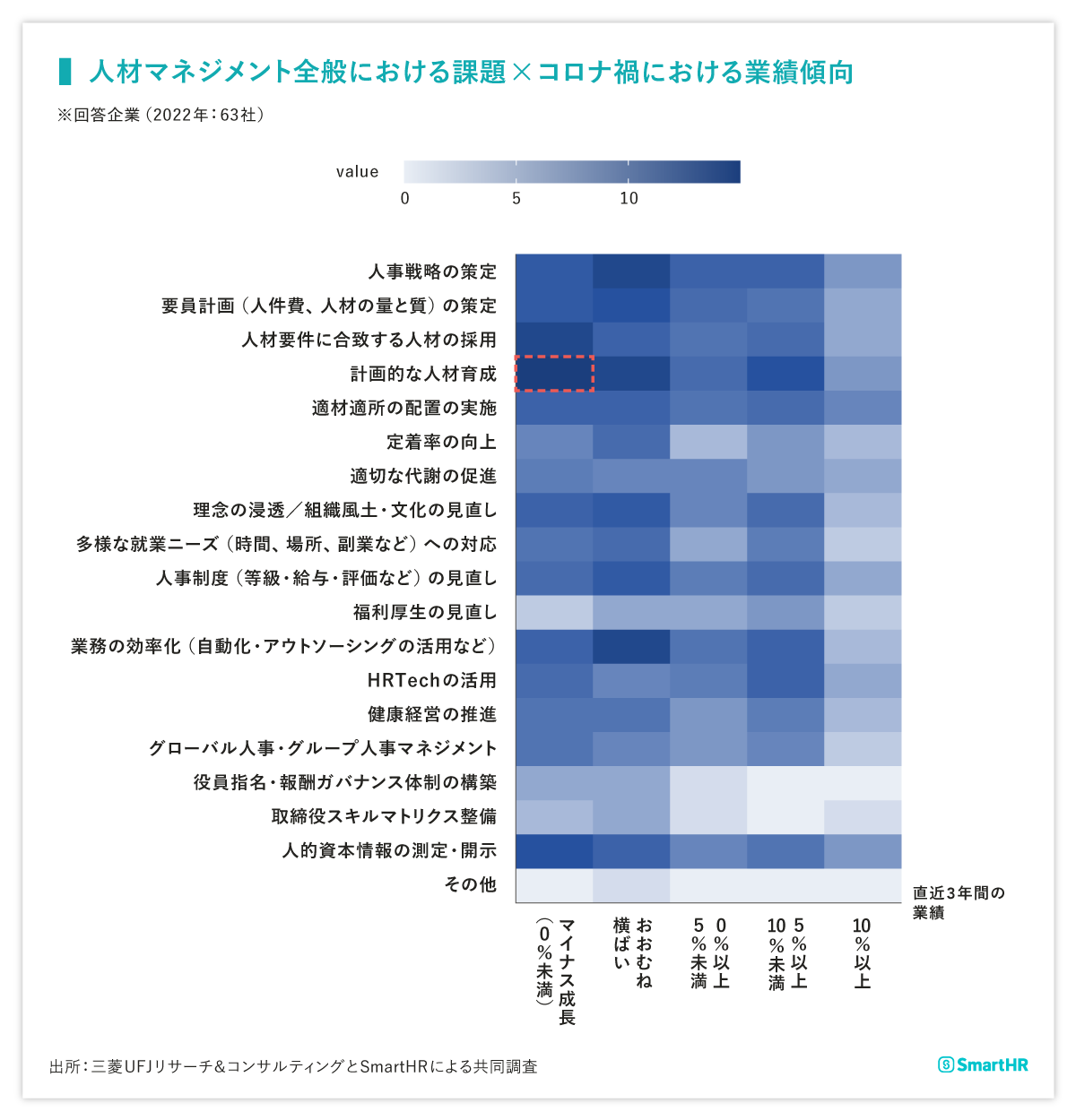 - コロナ禍(直近3年間)の業績がマイナス成長の企業では、「計画的な人材育成」を課題と感じている企業が多い