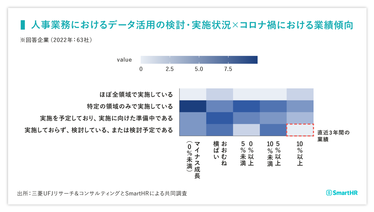 - コロナ禍(直近3年間)の業績が10%以上成長している企業では、人事業務においてデータ活用を実施していない企業は少ない