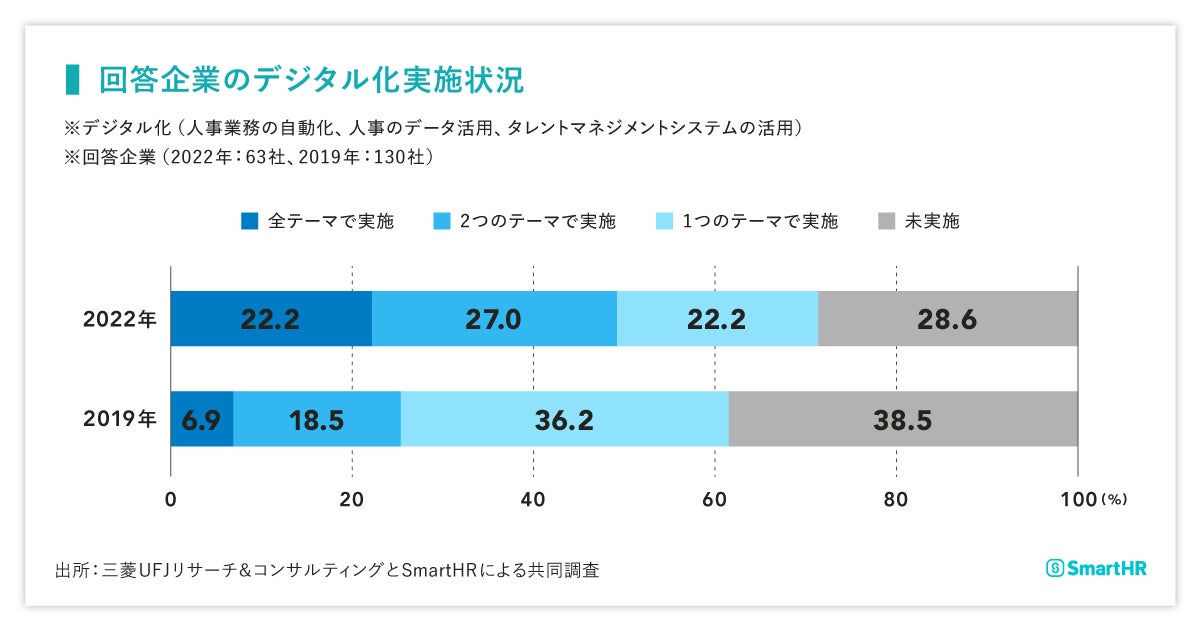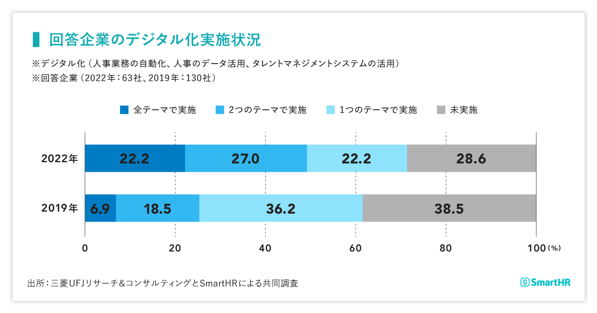 - 人事業務の自動化、人事のデータ活用、タレントマネジメントシステムの活用のすべてを実施している企業が約2割あり、前回調査に比べて約3倍に増えている。一方で、1テーマもデジタル化していない企業が約3割ある