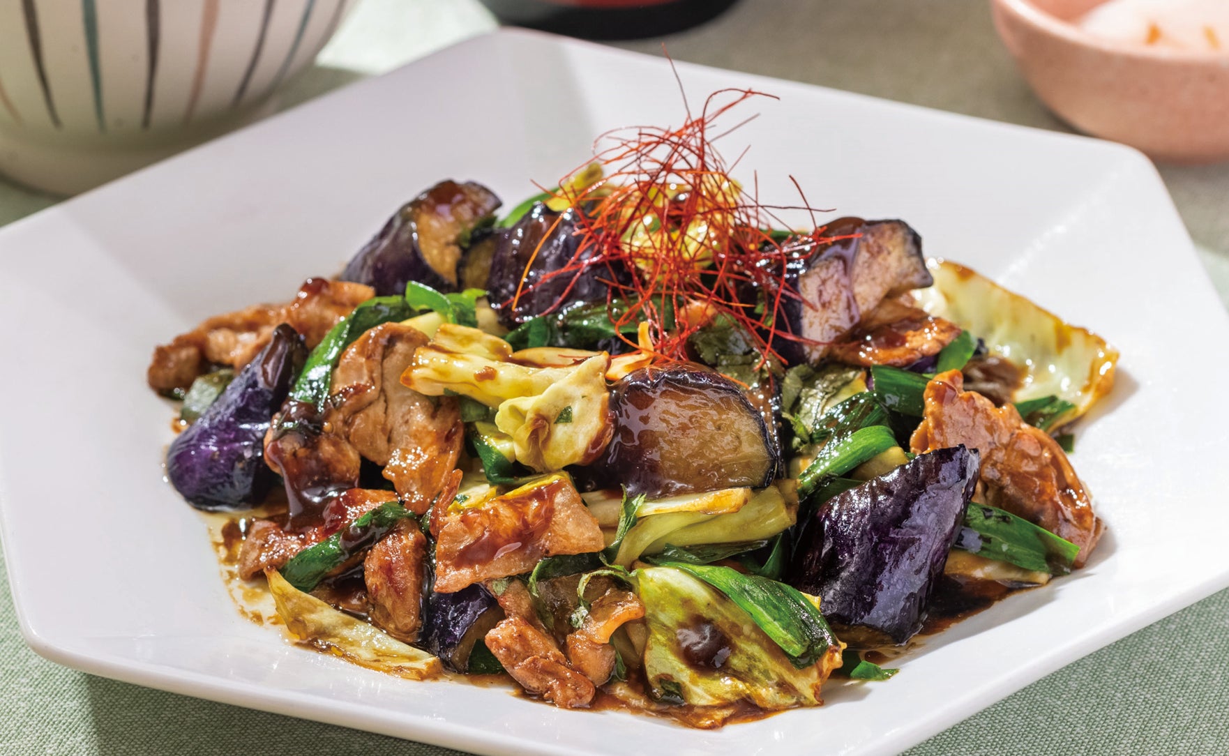 - こだわり!技あり!おすすめメニュー② 【茄子と豚のコク旨味噌炒め】