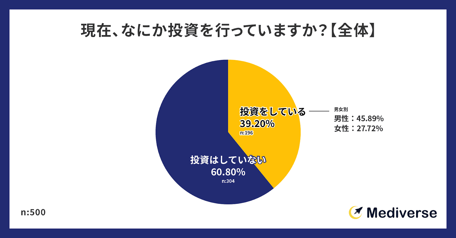 全体の約4割が現在なにかしらの投資を行っていると回答。男女別に見ると、約1.7倍の差が出ており、男性の方が投資に意欲的であることがわかる。