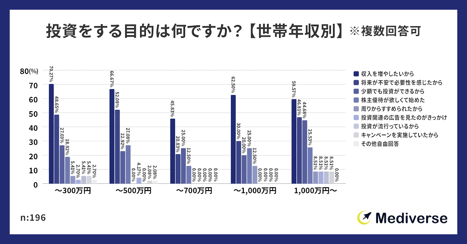 世帯年収別に見ると、投資手法や目的にもそれぞれ特徴が見られ、年収層と投資には一定以上の相関関係があることがうかがえます。
