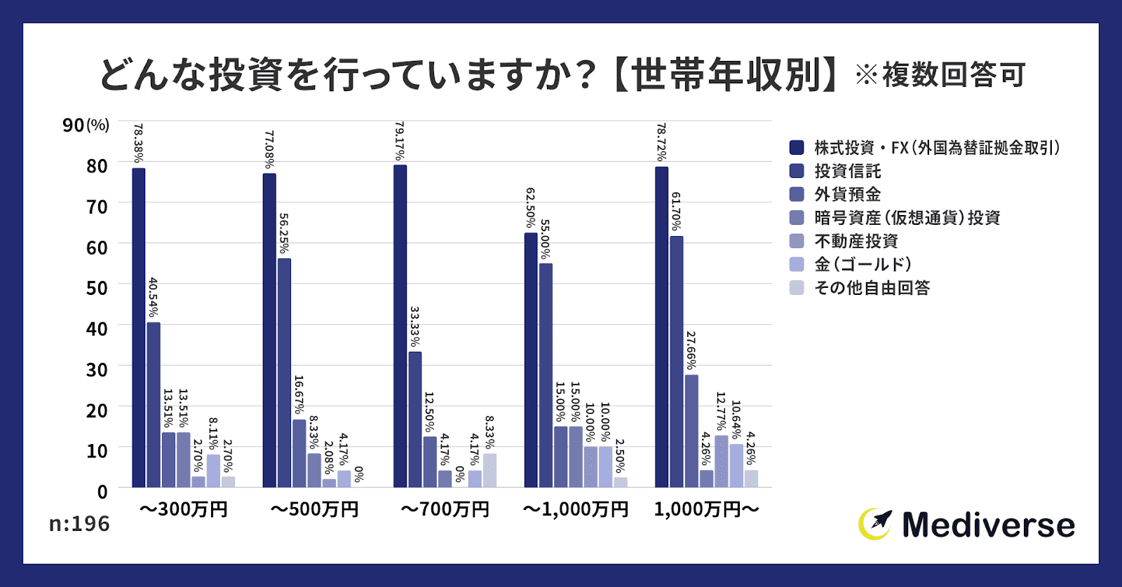 さらに、世帯年収別に見ても、いずれの年収層でも「株式投資・FX(外国為替証拠金取引)」がメジャーな投資手法であり、続く「投資信託」もすべての年収層において有力な投資手法だと捉えられていることがうかがえる。