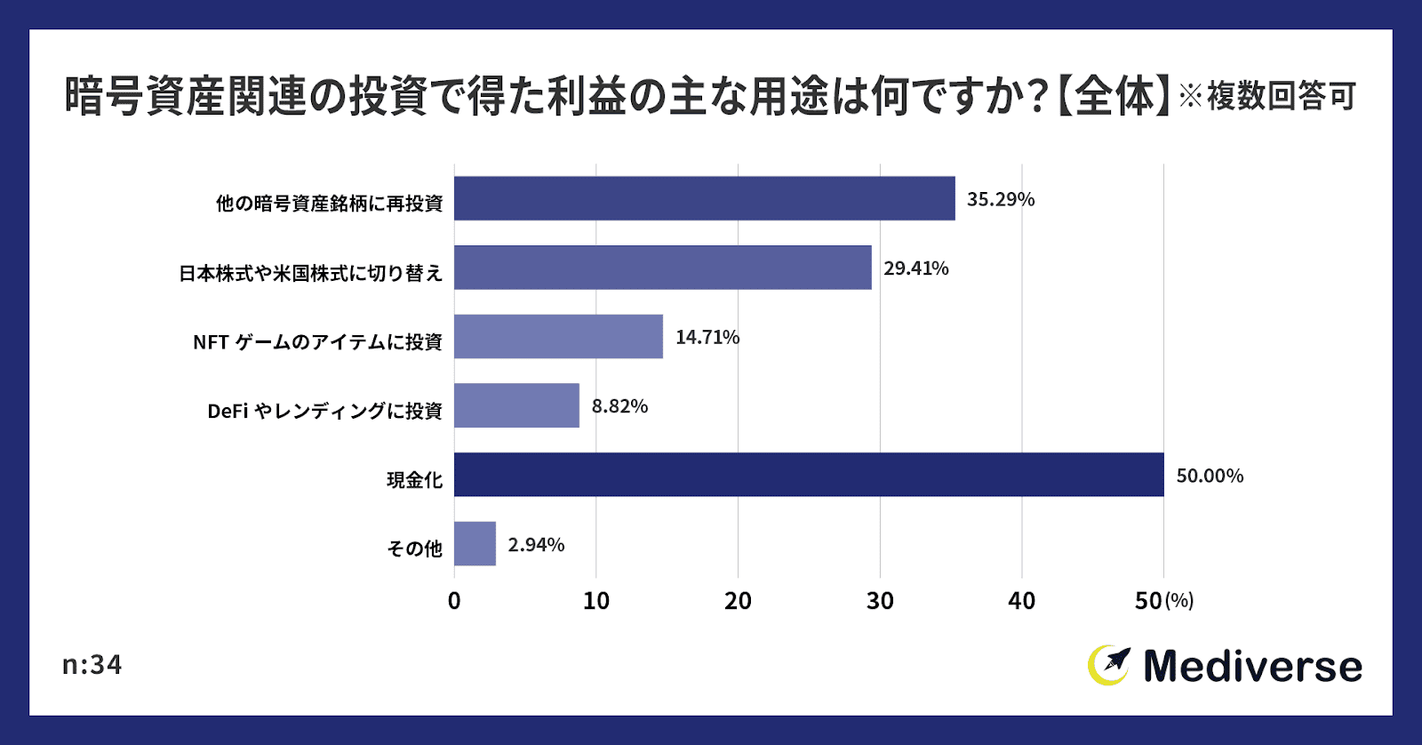 また、暗号資産(仮想通貨)関連の投資を行ったことがある人のうち、その投資で得た利益の主な用途としてもっとも多かったのは「現金化」50.00%であった。続いて、「他の暗号資産銘柄に再投資」35.29%、「日本株式や米国株式に切り替え」29.41%、「NFTゲームのアイテムに投資」14.71%という結果となった。