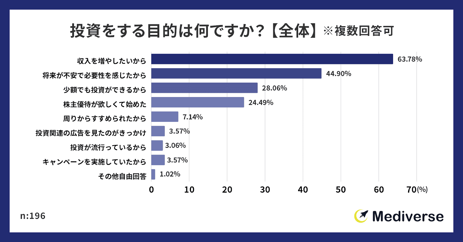 もっとも多かったのは「収入を増やしたいから」63.78%であり、続いて「将来が不安で必要性を感じたから」44.90%、「少額でも投資ができるから」28.06%、「株主優待が欲しくて始めた」24.49%という回答が上位を占めた。
