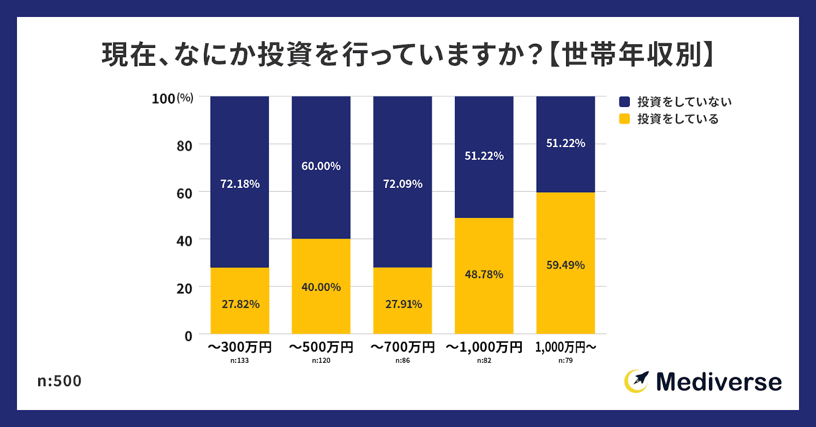 世帯年収別に見ると、700万円~1,000万円の年収層は全体平均を上回る約半数、1,000万円以上の年収層はさらに多い約6割がなにかしらの投資を行っていると回答する一方で、300万円以下および500万円~700万円の年収層は3割未満となっており、ここでも2倍近い差が見られた。