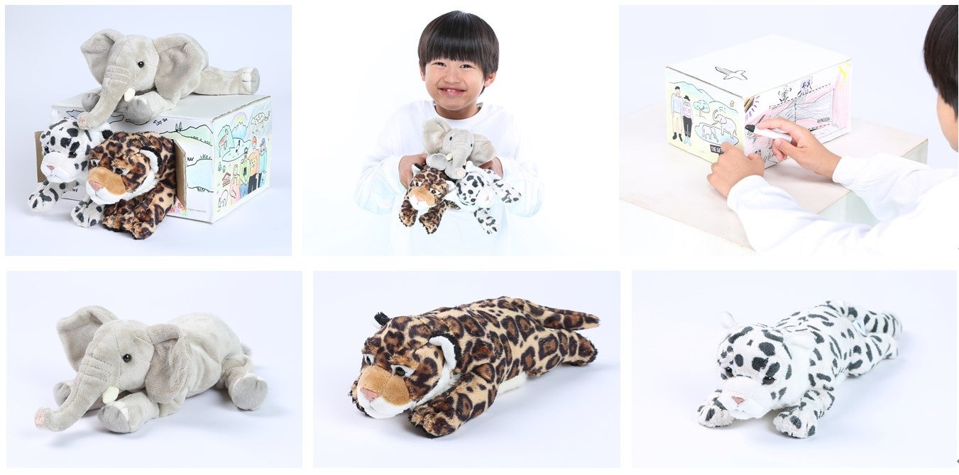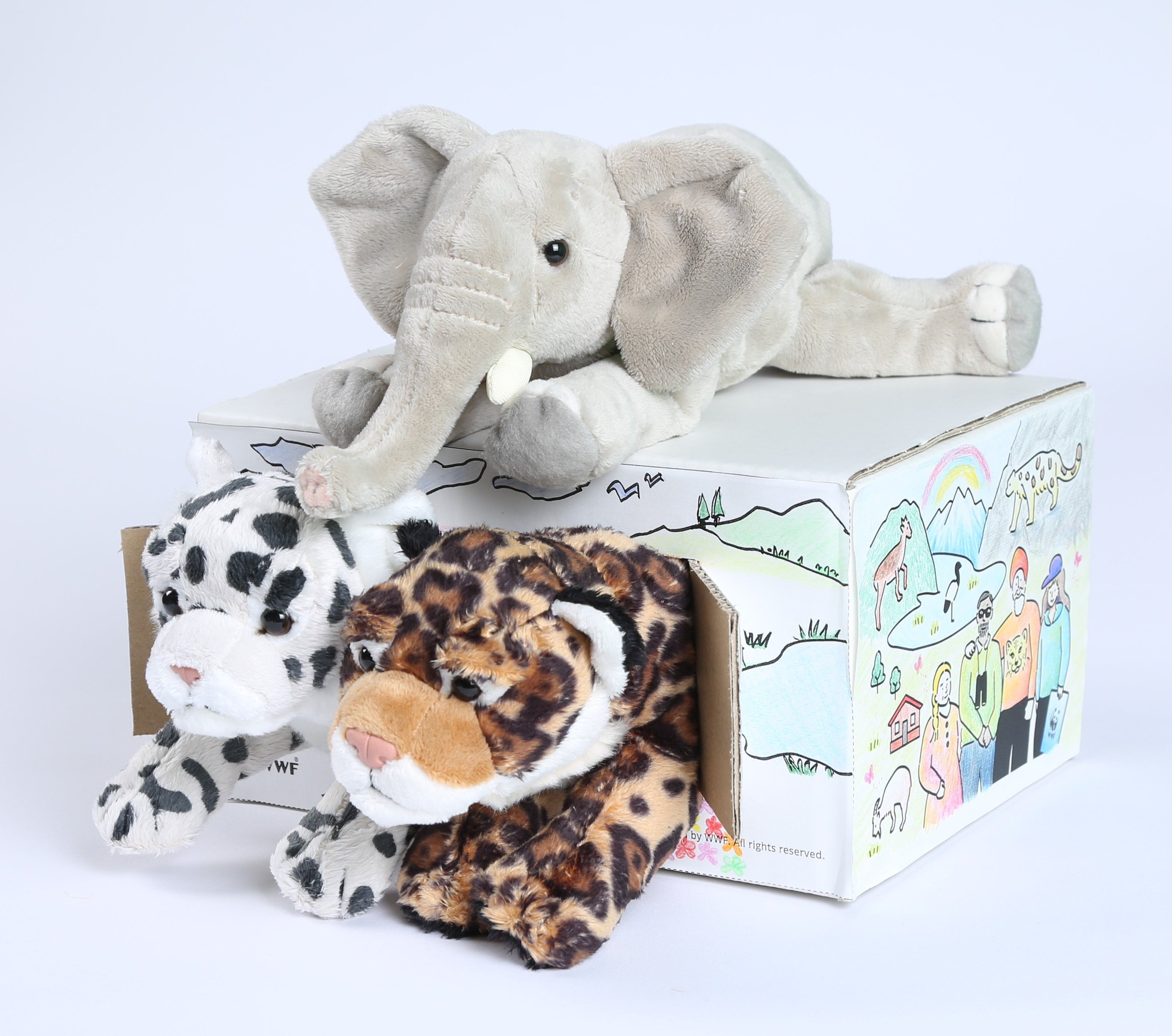 第三者に贈ることができる返礼品には、「野生動物アドプト制度」のスポンサー対象であるアフリカゾウ、ジャガー、ユキヒョウのぬいぐるみをご用意しました。配送時のダンボールには3種の野生動物とその生息地が白地で描かれており、動物たちの暮らしを想像しながら、塗り絵を楽しんでいただけます。また、返礼品にはWWFの想いがつまったウェルカムブックや、フリーアナウンサー・吉田明世さんのナレーションでお届けする野生動物の解説動画にアクセスできる限定公開URLも含まれています。