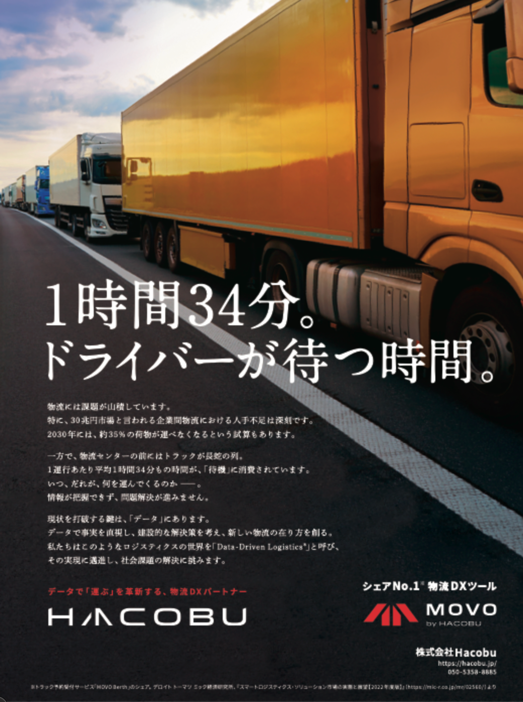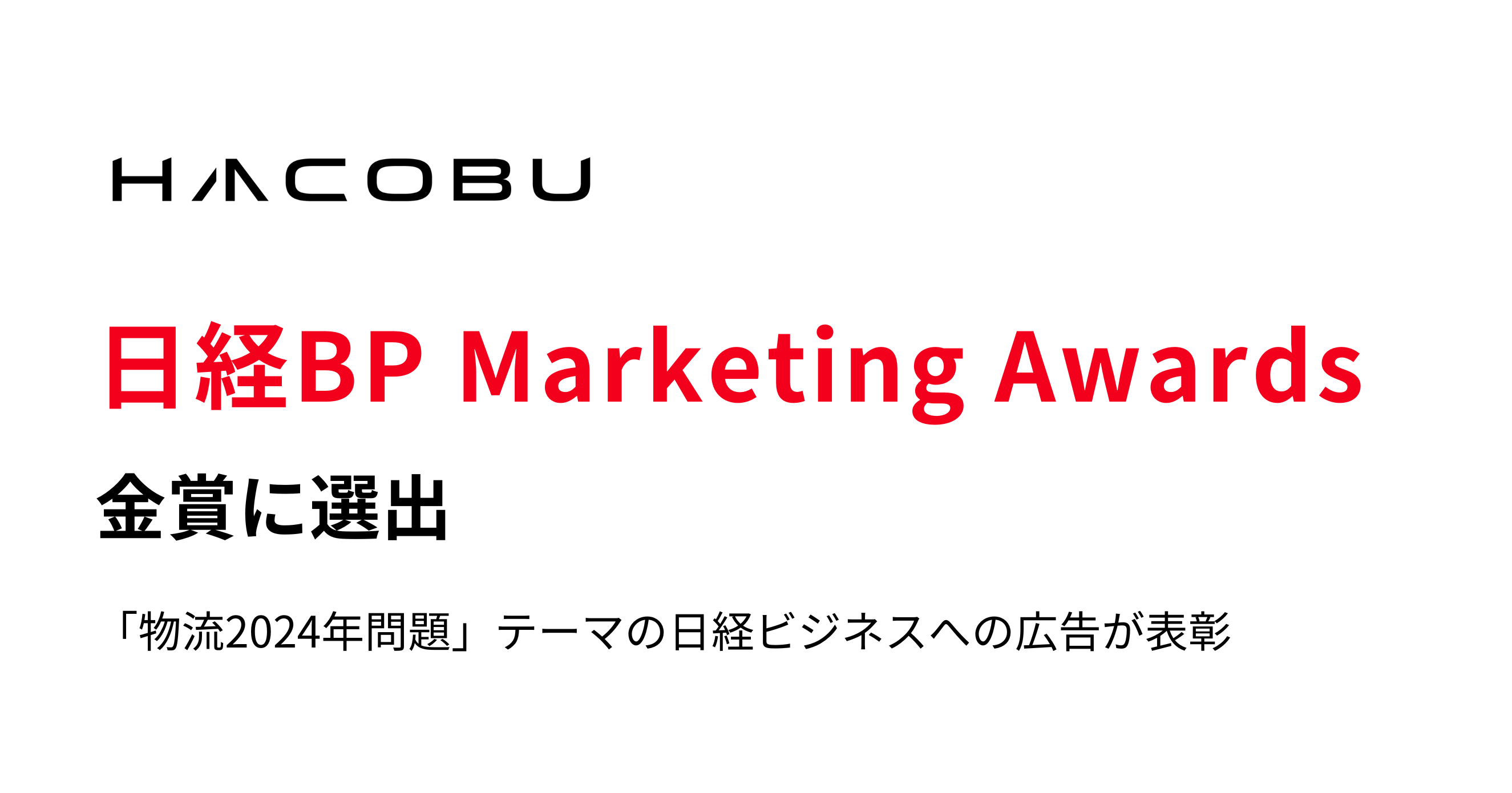 表彰されたのは、「物流2024年問題」をテーマとして日経ビジネスに掲載した、Hacobuの企業広告です。