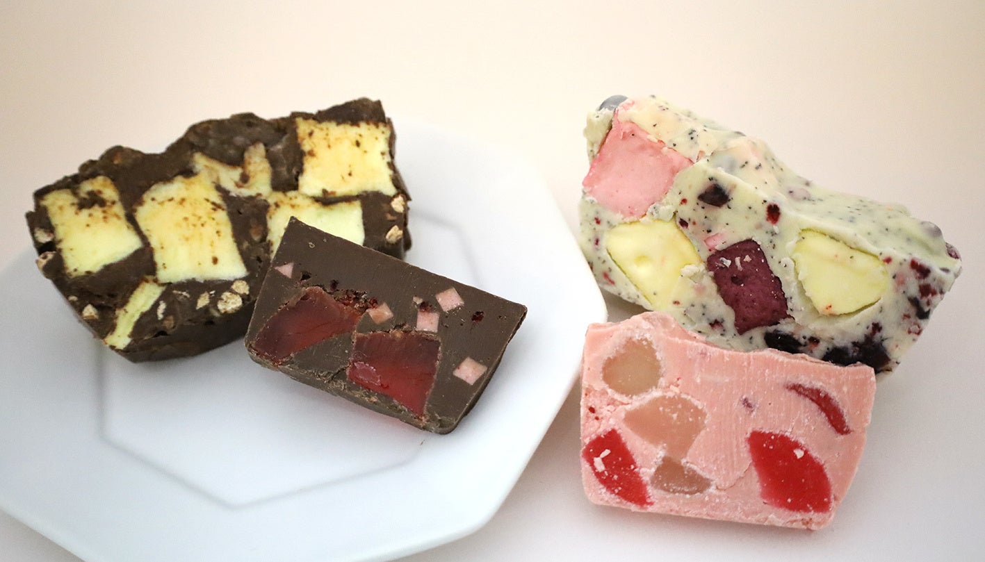 マシュマロ入りチョコレート菓子“ロッキーロード”は、この時期限定のキャラメルフランボワーズとアールグレイベリー。