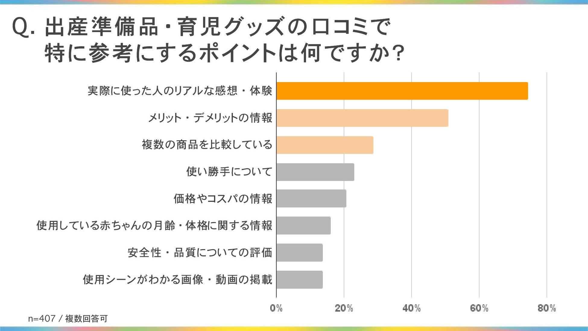 80%近くのパパママが「良い面だけでなく、実際に使って気付いた懸念点などのリアルな評価も知りたい」と回答しました。 単なる情報の取捨選択ではなく、実際に使ってみて感じた「デメリット」や「他社製品との細かな違い」といった、忖度のないリアルな感想こそが、生活者の深い納得へと繋がります。