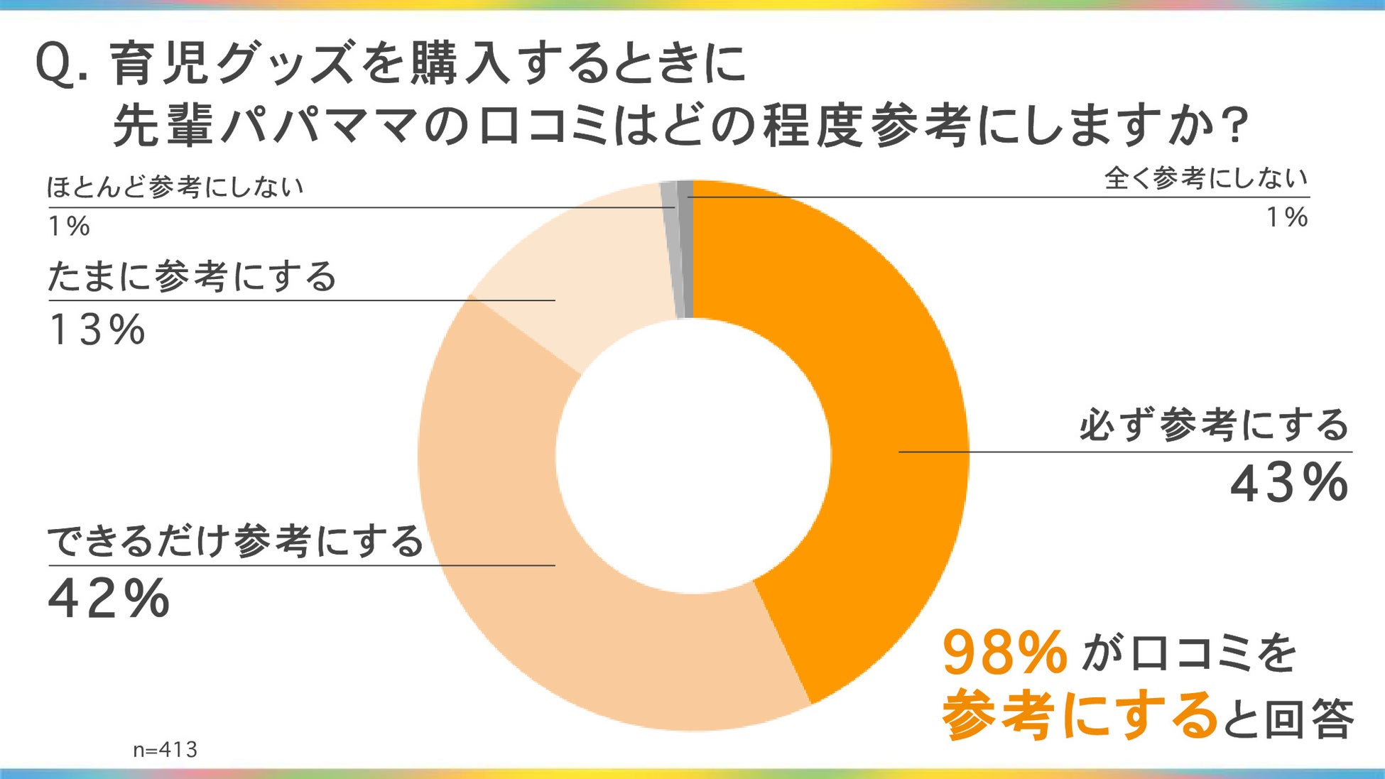 購入時に、先輩パパママの口コミを「参考にする」と回答した人は98%に達しました。この結果から、実体験に基づいた第三者の評価が、購買意思決定における不可欠な要素となっていることが分かります。