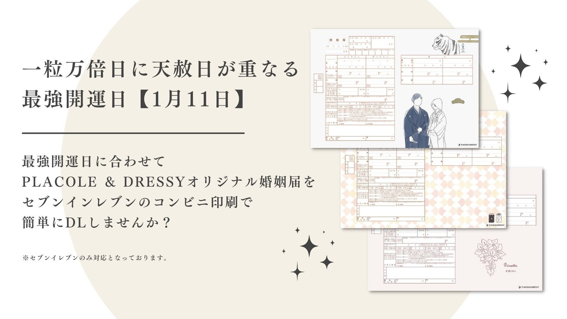 花嫁アプリ「PLACOLE & DRESSY」を運営する、冒険社プラコレ(本社:神奈川県鎌倉市、代表取締役CEO:武藤功樹)は、天赦日と一粒万倍日が重なる吉日である1月11日(火)に合わせ、『プラコレオリジナル婚姻届』24種のコンビニ印刷を期間限定で実施することが決定しました。