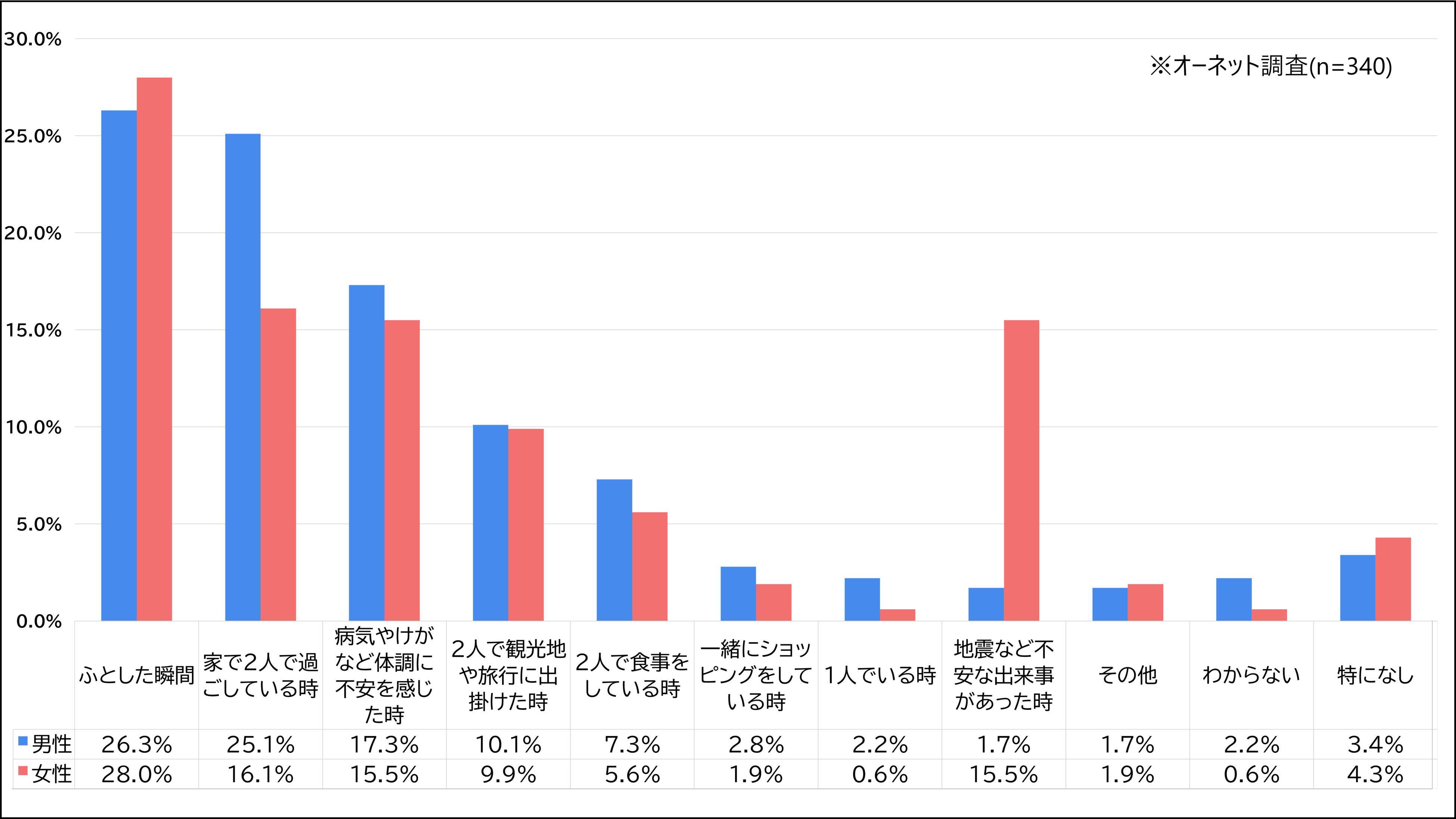 また、女性については「地震など不安な出来事があった時」の回答が男性よりも13.8ポイント高い結果となりました。男性よりも災害など不安な出来事があった時に、パートナーの存在が心の支えになるのだと考えられます。