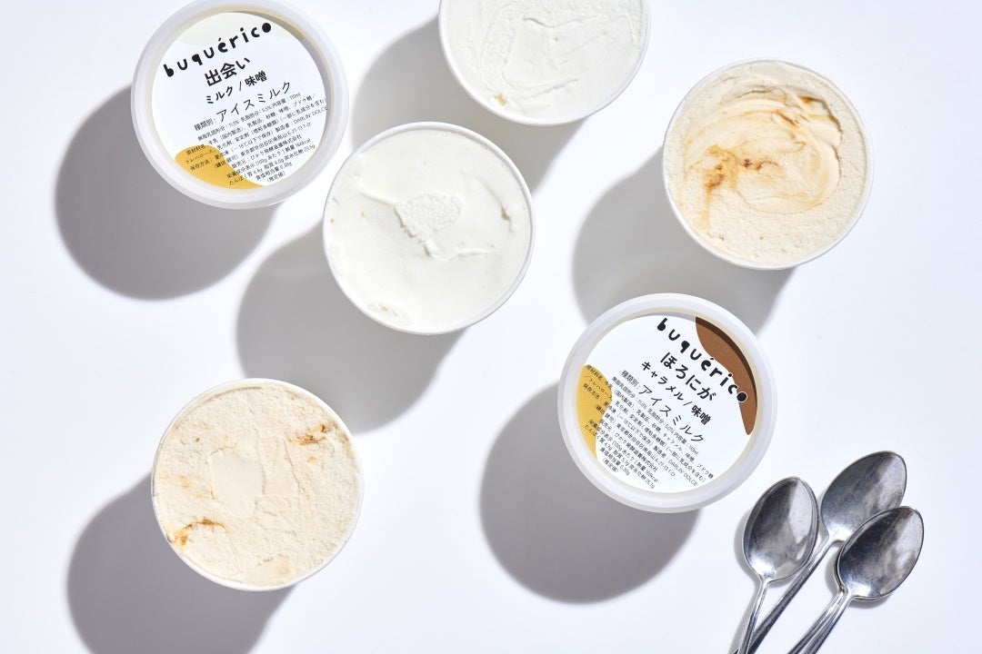 心に残る、誰かとの甘い思い出。その甘さにはさまざまな表情があります。それは「大人の、甘くない、ご褒美」としてお届けする『buquérico』のジェラートも同じ。各フレーバーには、それらの大切な思い出を表現した名前がついています。これまでに「ブケリコ 出会い ミルク/味噌󠄀」 「ブケリコ ほろにが キャラメル/味噌󠄀」「ブケリコ 初恋 ヨーグルト/あんず」 「ブケリコ 片思い 甘酒/バナナ」の4種を展開しています。