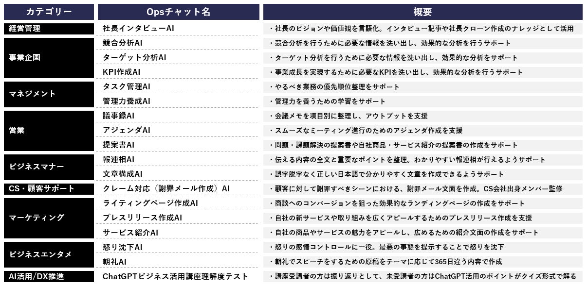 今回リリースした3つ以外にも、既に法人向けChatGPT「Ops(オプス)AI」には当社独自開発のGPTsが搭載されています。