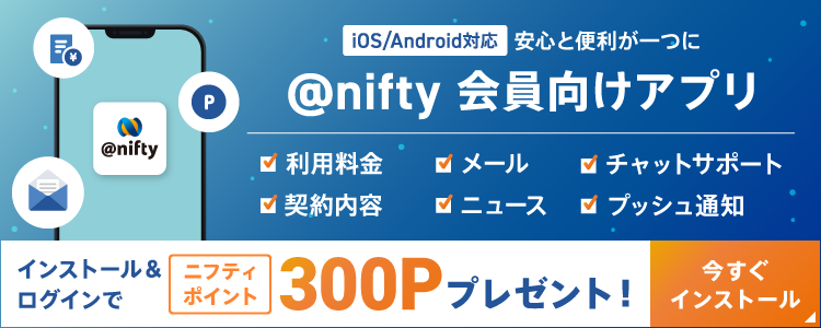 @niftyプロバイダーサービスを利用の個人会員の方が、期間内に「マイ ニフティ」 (iOS版・Android版)をインストールしログインすると、もれなくニフティポイント300ポイントをプレゼント。