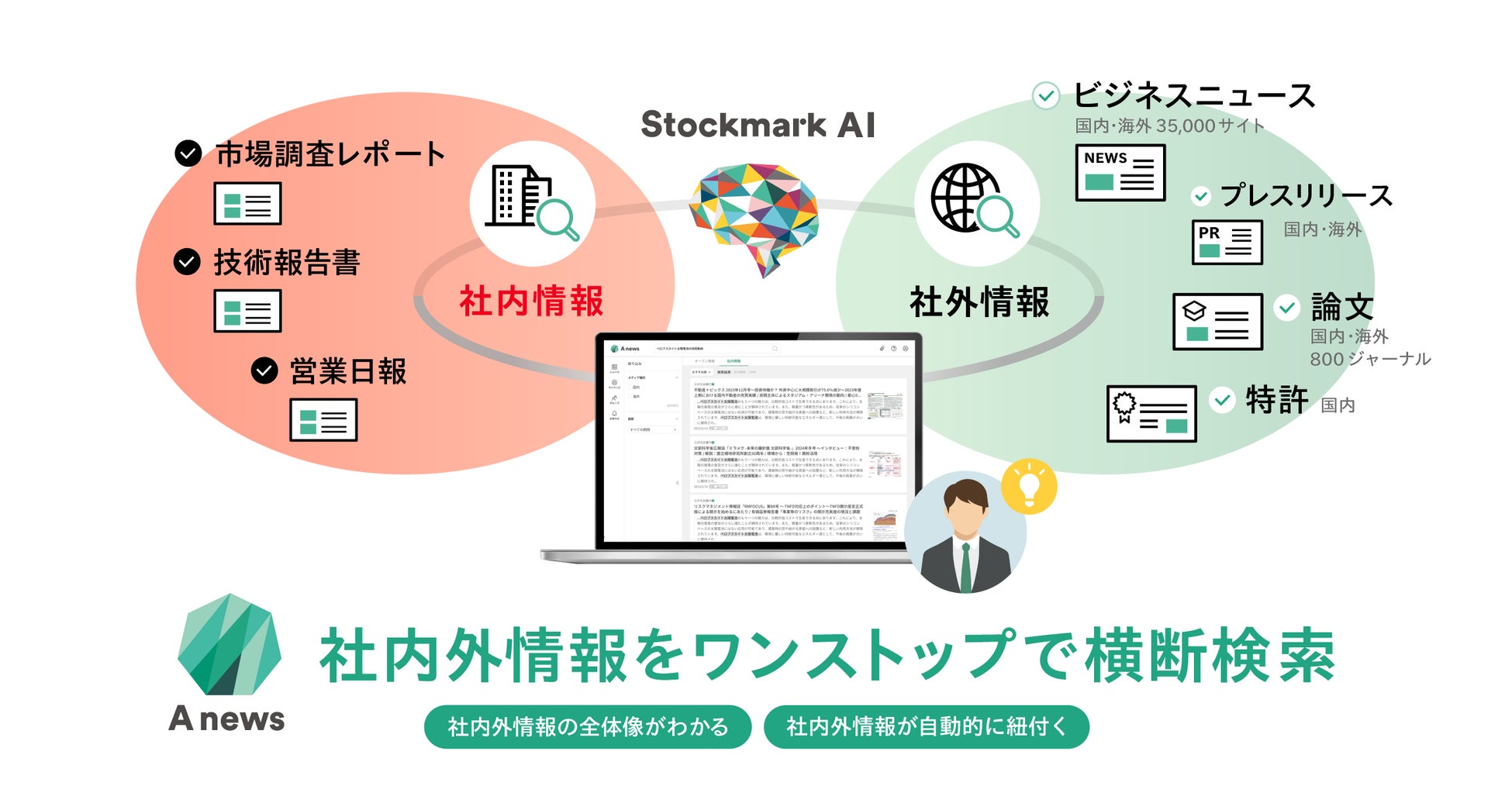 Anewsは最先端の自然言語処理技術を活用した組織で情報収集/市場分析を共有できるナレッジマネジメントサービスです。国内外約35,000サイトのニュース、特許・論文・官公庁の報告書などの公開情報に加え、組織に眠る膨大な社内情報まで、ビジネス領域で役立つ様々な情報へ一括でアクセスすることができます。