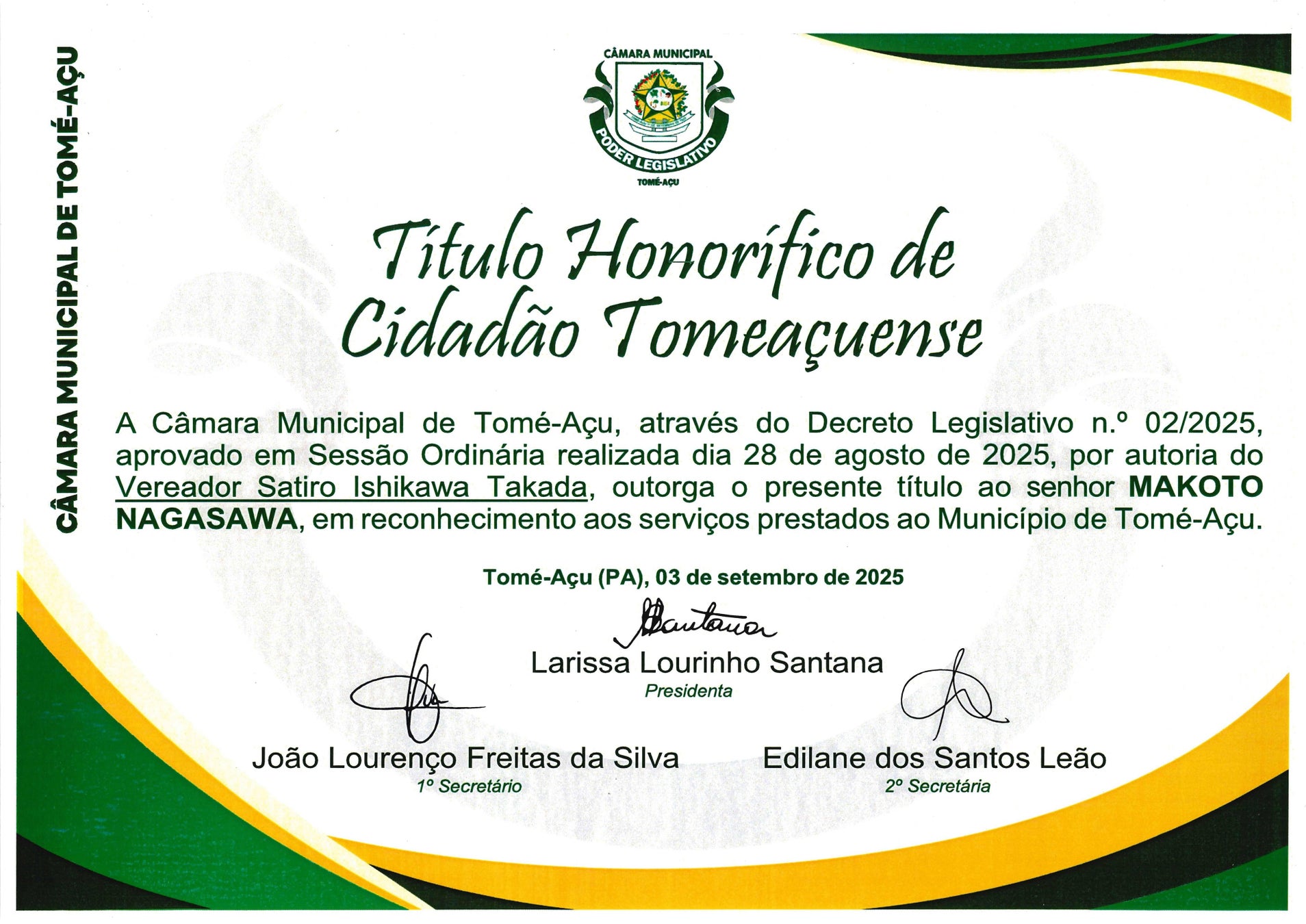 フルッタフルッタ代表の長澤がブラジルパラ州トメアス市名誉市民の称号を授与されました