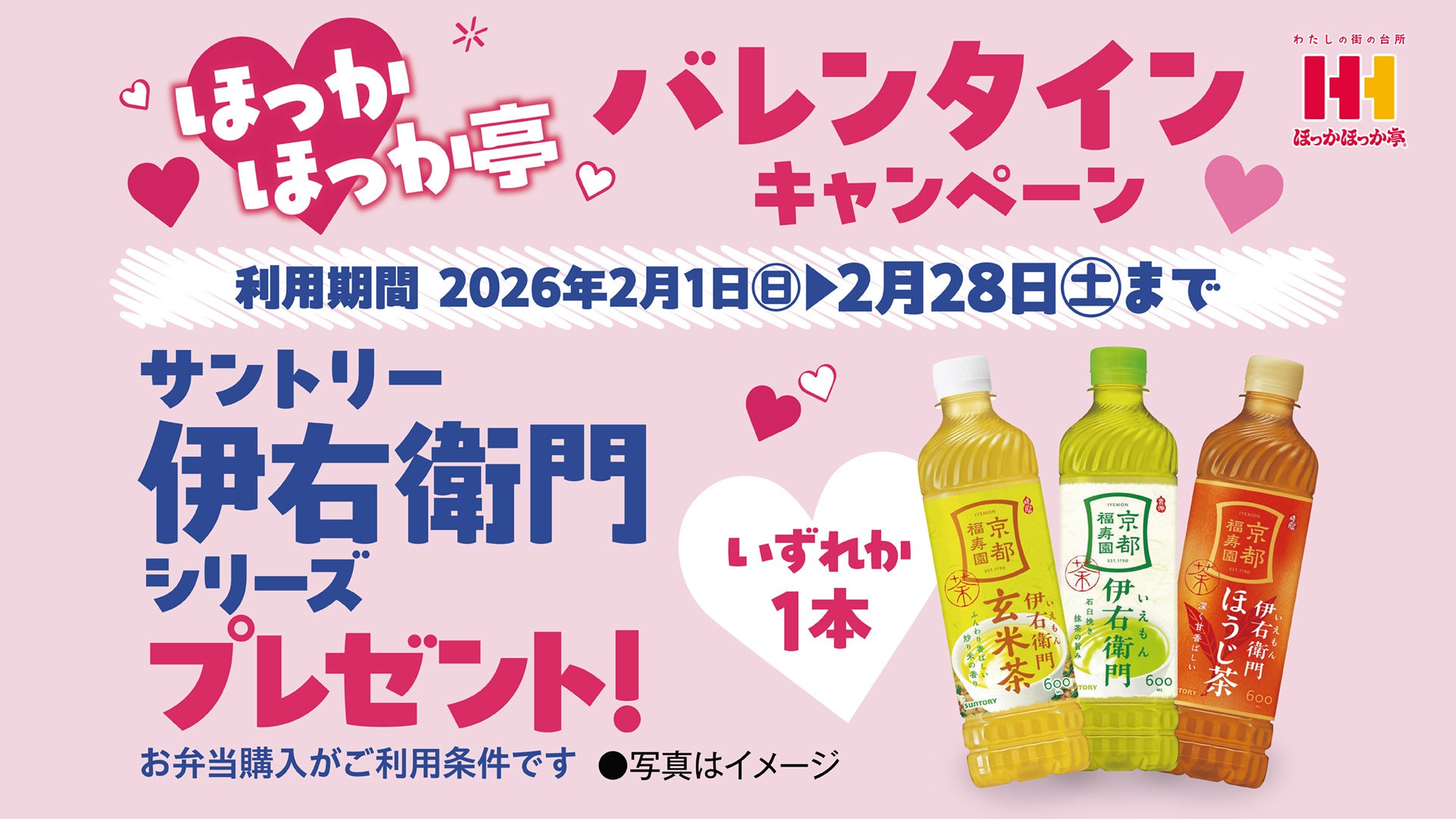 持ち帰り弁当事業のパイオニアである「株式会社ほっかほっか亭総本部(本社:大阪府大阪市、代表取締役会長兼社長:青木達也)は、2026年2月1日(日)より、日ごろのご愛顧に感謝を込めて、「バレンタインキャンペーン」と題し、次回来店時にサントリーの人気飲料「伊右衛門シリーズ」が最大3本もらえる特別クーポンをプレゼントいたします。