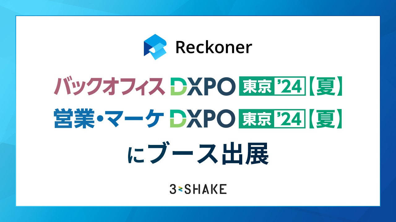株式会社スリーシェイク(本社:東京都新宿区、代表取締役社長:吉田 拓真、以下スリーシェイク)が提供する、クラウド型データ連携ツール「Reckoner(レコナー)」は、2024年7月23日(火)〜26日(金)に東京ビッグサイトで開催される「第3回 バックオフィスDXPO 東京'24(夏)」と「第3回 営業・マーケDXPO東京’24(夏)」にブース出展することをお知らせします。