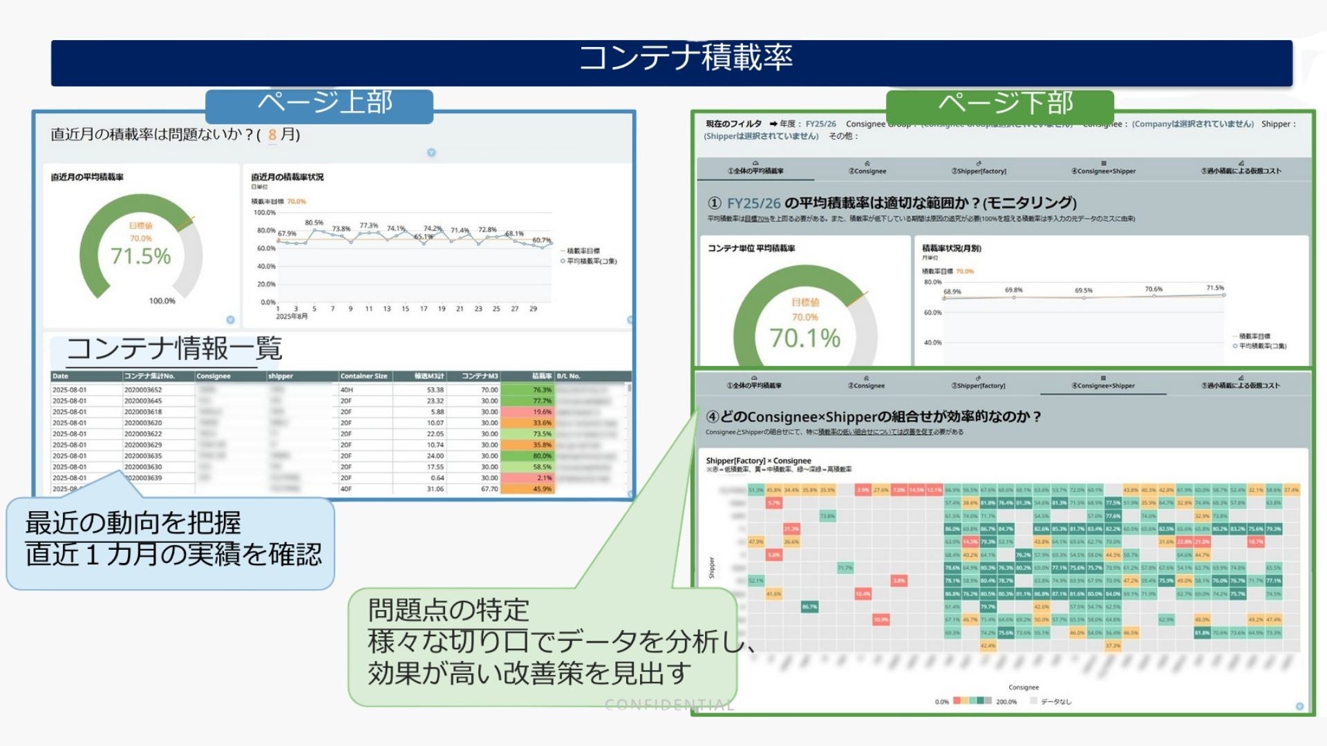 キャリア、積地港/揚地港、運賃、輸送リードタイム等の海上輸送情報をダッシュボード上に集約するとともに、コンテナの最大積載量に対して実際の運搬量をDomoで可視化し、出荷効率の実態を網羅的かつ直感的に把握できるようにました。このことにより、積載率の改善やコスト削減策を実態に基づいて検討できるようになりました。