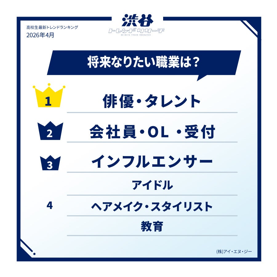 1位には「俳優・タレント」がランクインしました。「自分を表現する仕事に憧れる」(高1・女子)という声のほか、「推しから元気をもらっているので、今度は私が誰かに元気をあげる存在になりたい」(高2・女子)といったコメントも。単なる憧れだけでなく、自身が受けた感動を誰かへ繋げたいという、志の高い意見も目立ちました。続く2位には「会社員・OL・受付」が選出されました。「安定した仕事に就きたい」(高3・男子)といった堅実な意見が散見され、不透明な社会情勢を背景に、着実な生活設計を望む高校生のリアルな姿もうかがえます。3位には、もはや定番の人気職種となった「インフルエンサー」が登場。昨今はインスタグラマーやYouTuber、TikTokerなど活躍の場が多角化しており、単なる情報発信に留まらず、ブランドプロデュースやイベント開催などマルチに活躍するロールモデルが次々に登場しています。SNSを身近な自己実現の場と捉える高校生にとって、ますます魅力的な職業となっているようです。