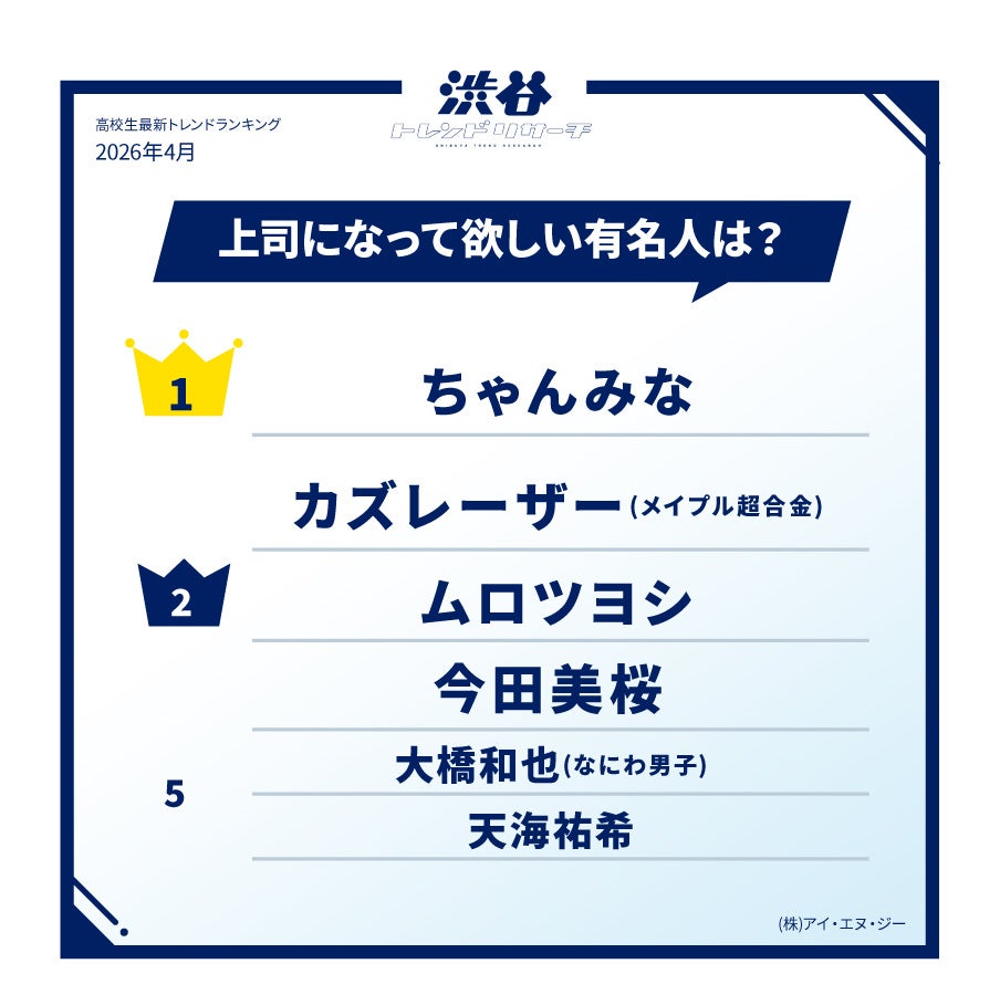 堂々の第1位には「ちゃんみな」が選ばれました。ガールズグループオーディション『No No Girls(ノーノーガールズ)』にて、参加者一人ひとりに真摯に向き合い成長を支える姿が大きな反響を呼び、「HANAのメンバーの成長ぶりとマインドに憧れる」(高2・女子)、「良い点と改善点を明確に伝えてくれそう。褒めるだけでなく、ちゃんと叱ってくれる信頼感がある」(高2・男子)といった、彼女の確固たる信念と人間性に憧れる声が殺到しました。同率2位には、お笑い芸人の「カズレーザー(メイプル超合金)」、俳優の「ムロツヨシ」「今田美桜」の3名がランクイン。「カズレーザー」には「芯を持っていて意見がはっきりしている」(高1・男子)、「ムロツヨシ」には「頼りがいがあり、毎日笑わせてくれそう」(高3・女子)、「今田美桜」には「可愛くて元気な姿を見ると自分も頑張れる気がする」(高1・女子)といったコメントが寄せられました。