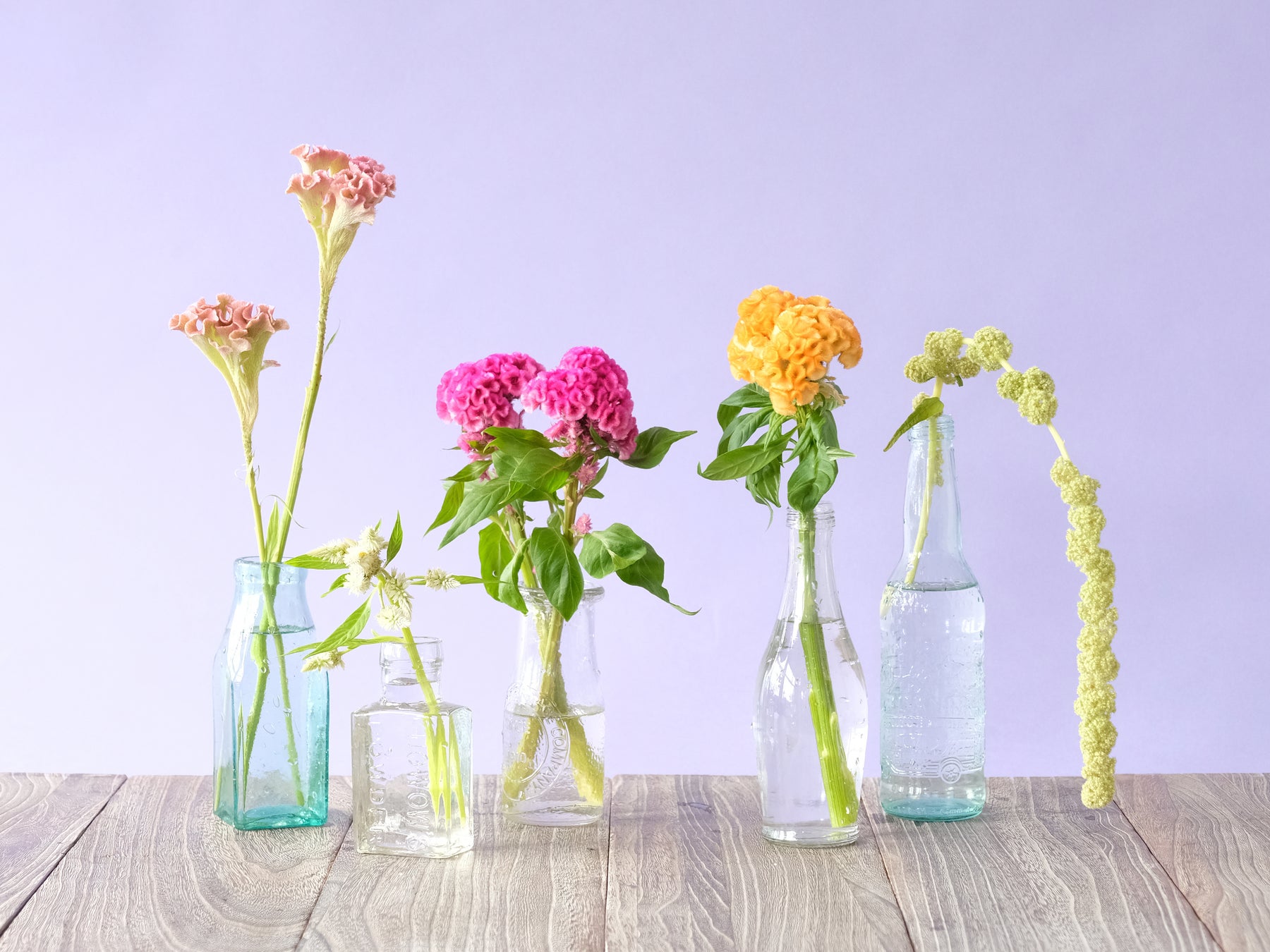 左上:様々な形のケイトウを一輪挿しにいけて並べてみました。すっきりした茎とボリュームのある花の対比を楽しむあしらいです。