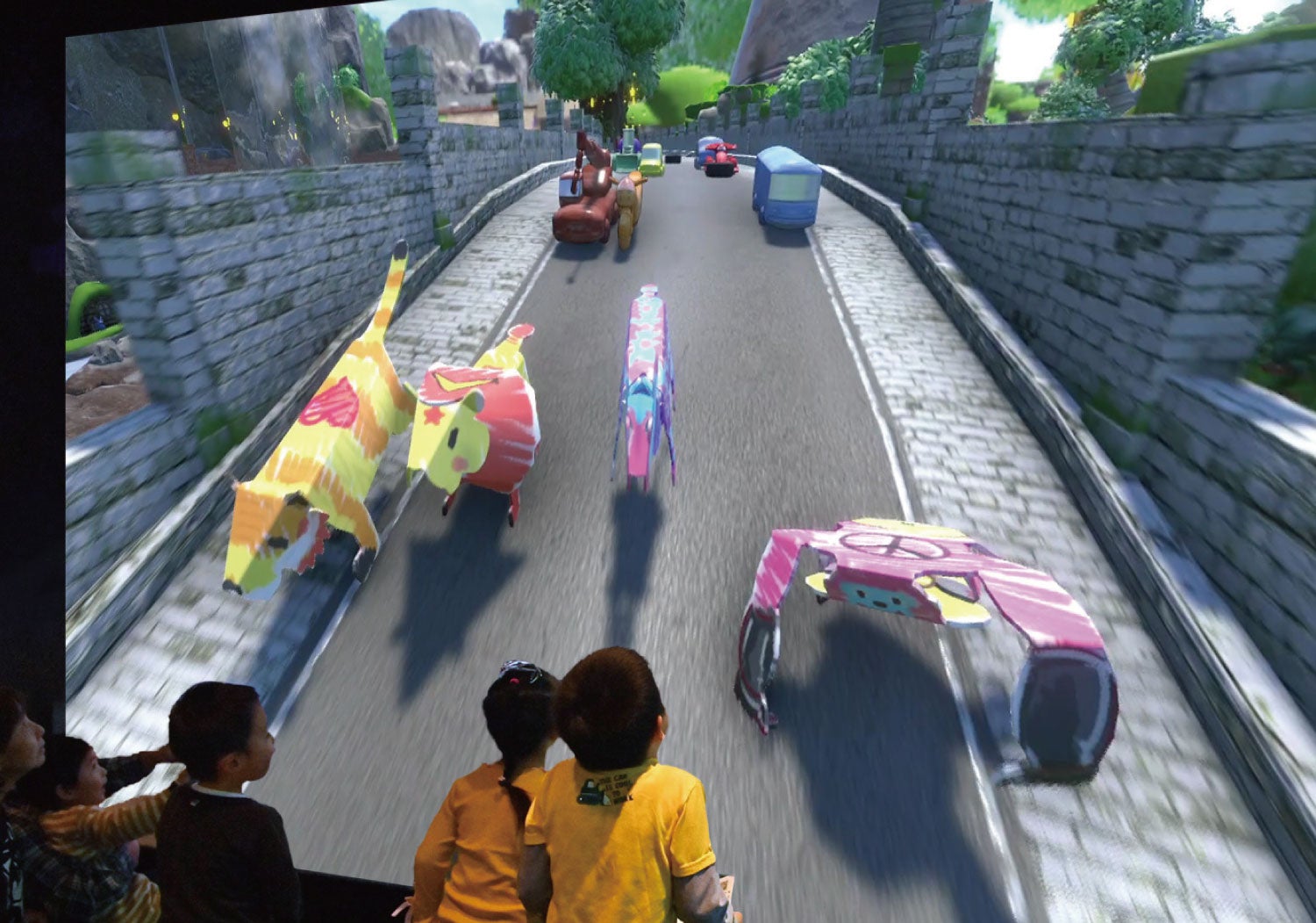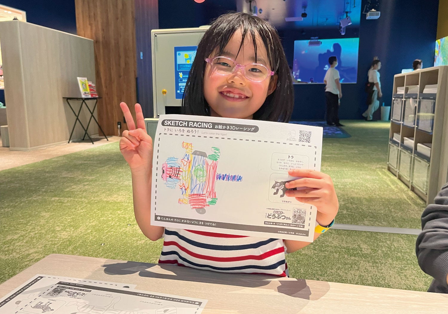 紙に描いた乗り物の絵がカーレースを繰り広げる「SKETCH RACING」では、『小学館の図鑑NEOのクラフトぶっく はじめてのりったいどうぶつかん』とコラボした専用ぬりえが登場。自由に色をぬったクラフトシートをスキャンすると、平面だった動物がスクリーンの中で立体になって動き出し、白熱のレースに参戦します。