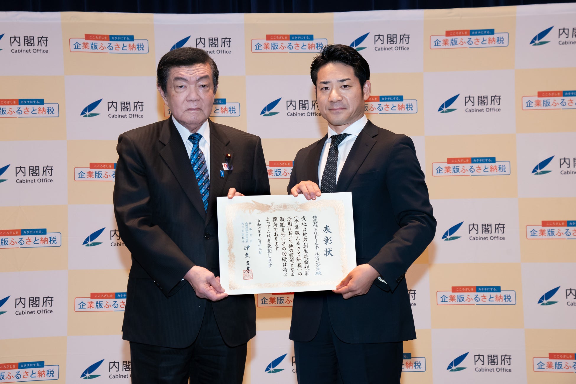 「地方創生応援税制(企業版ふるさと納税)に係る大臣表彰」は、平成30年度から毎年度、その制度の活用において、特に顕著な功績を上げ、他の模範となると認められる活動を行った企業や地方公共団体を内閣府特命担当大臣(地方創生担当)から表彰いただくものです。