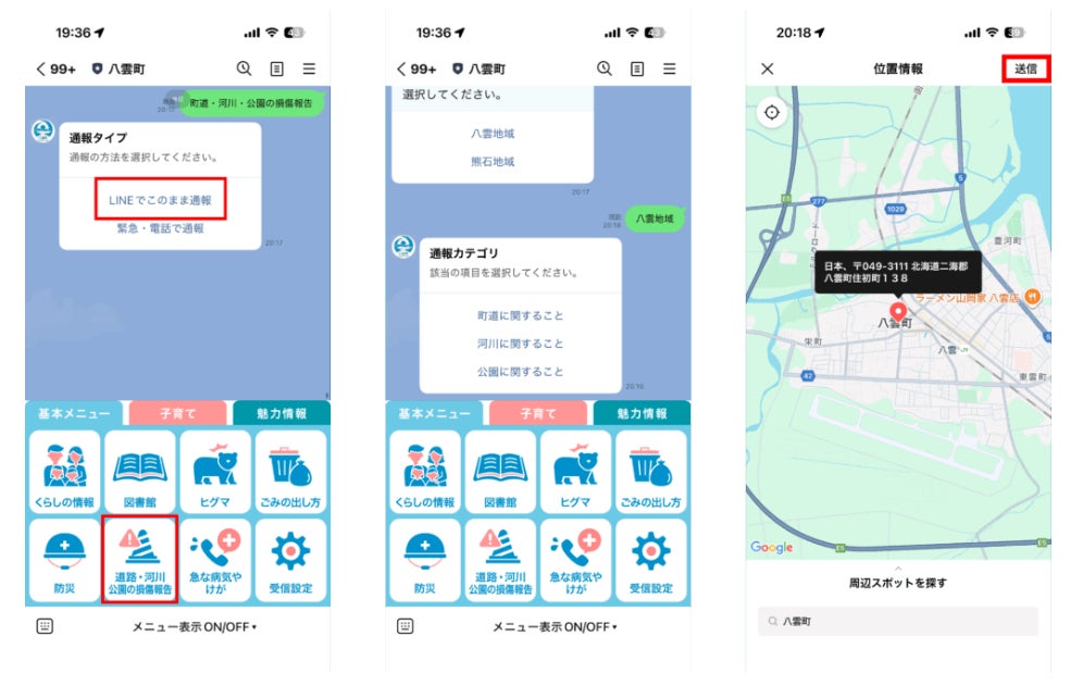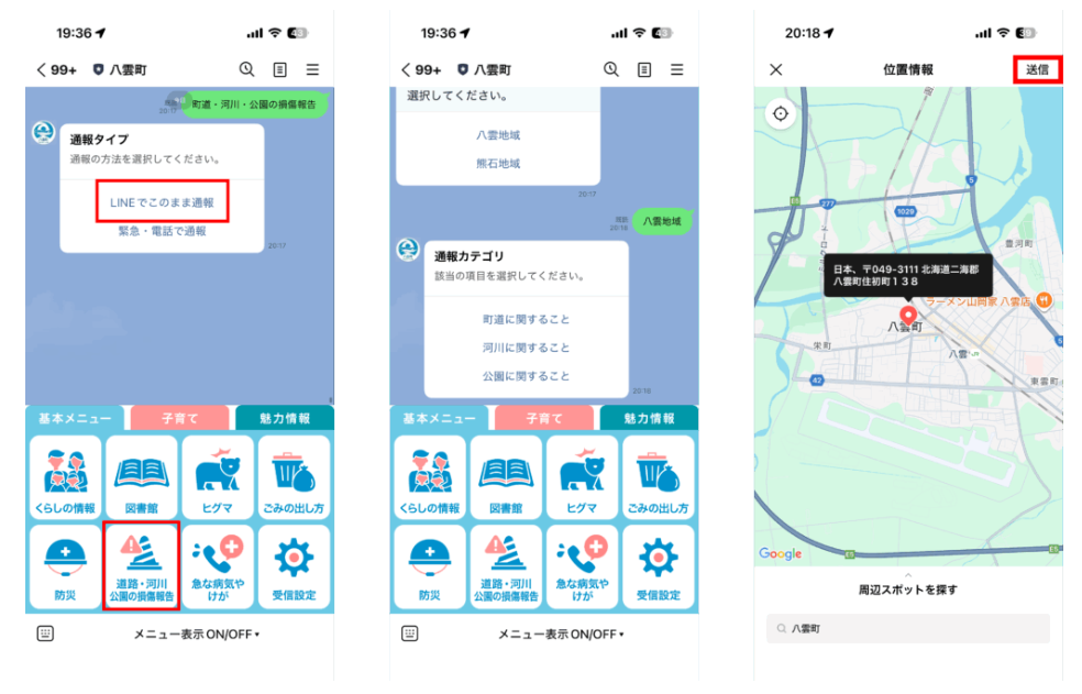 住民はチャットボットの案内に従い、現場の写真や位置、詳細情報を送ることで通報することが可能です。