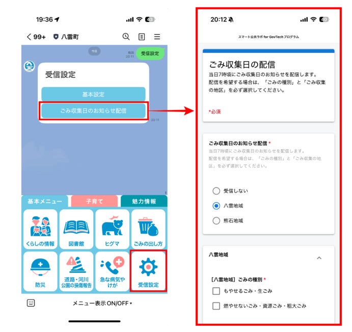「ごみ収集日のお知らせ配信」の受信設定では、住んでいる「地区」と受け取りたい「ごみの種別」の情報を入力すると、各地区のごみ収集スケジュールに応じて、収集日の当日にリマインド通知を受け取ることができて便利です。