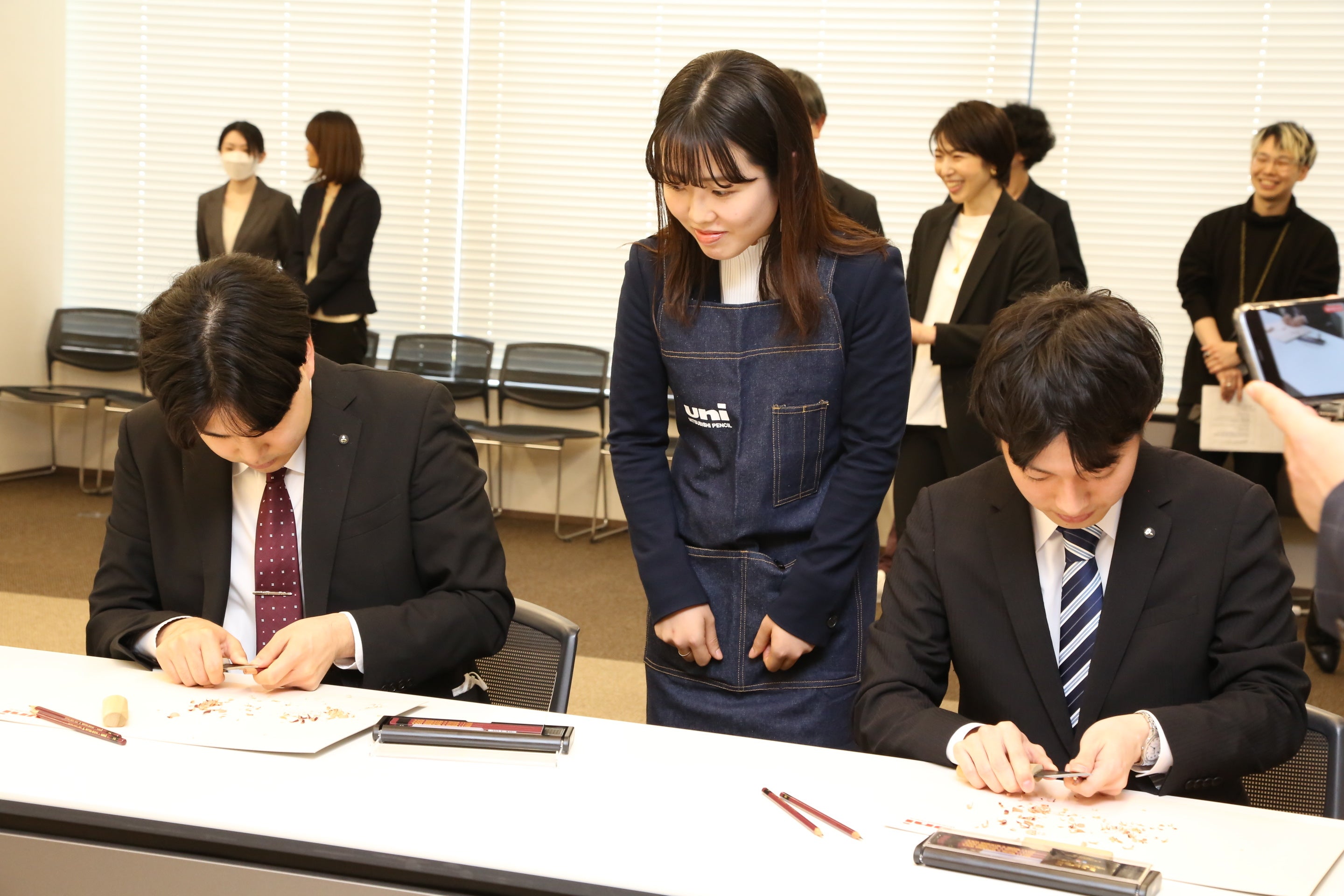 『鉛筆けずり入社式』では、2023年度入社の新入社員が、創業の原点である「鉛筆」を先輩社員に教わりながら小刀でけずりました。新入社員には、「2023.4.1 Welcome to Mitsubishi Pencil」と名入れされている鉛筆「uni(ユニ)」が1ダースずつ配られました。